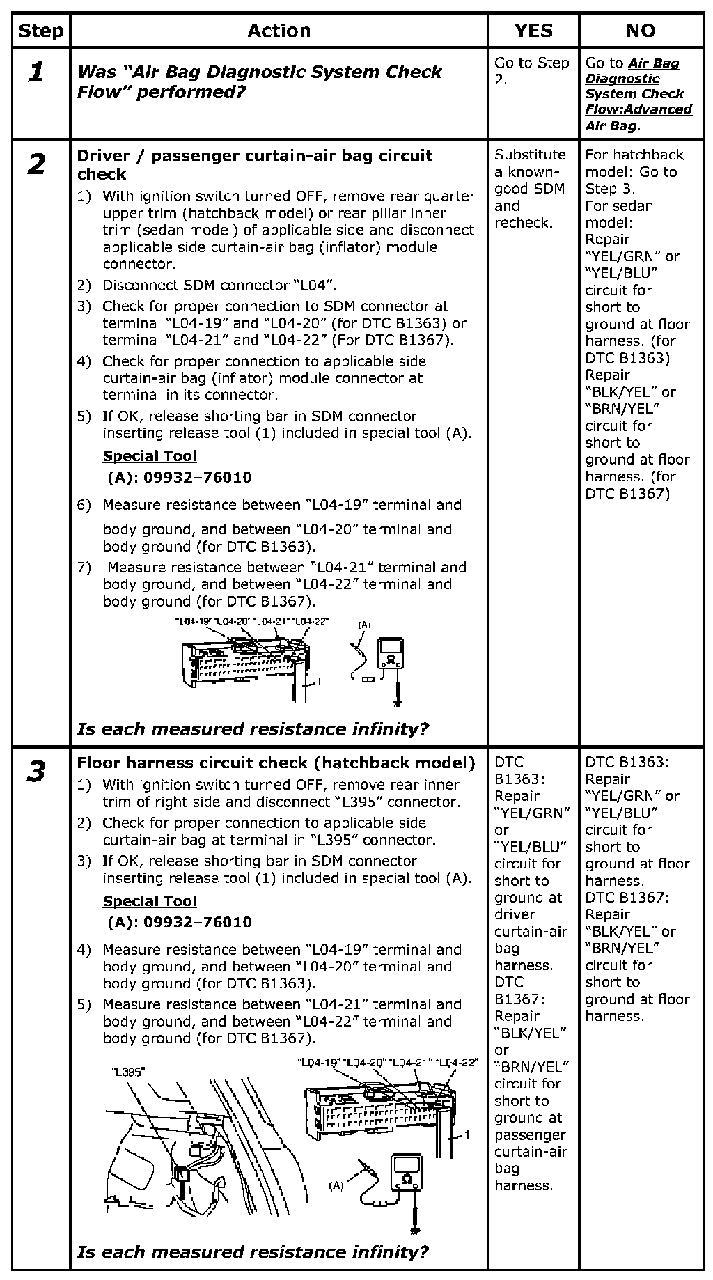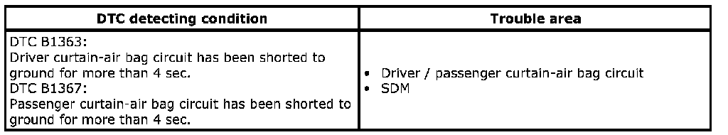 DTC B1363 / B1367: Curtain-Air Bag Circuit Shorted to Ground(DTC B1363: Driver Curtain-Air Bag Circuit Shorted to Ground)