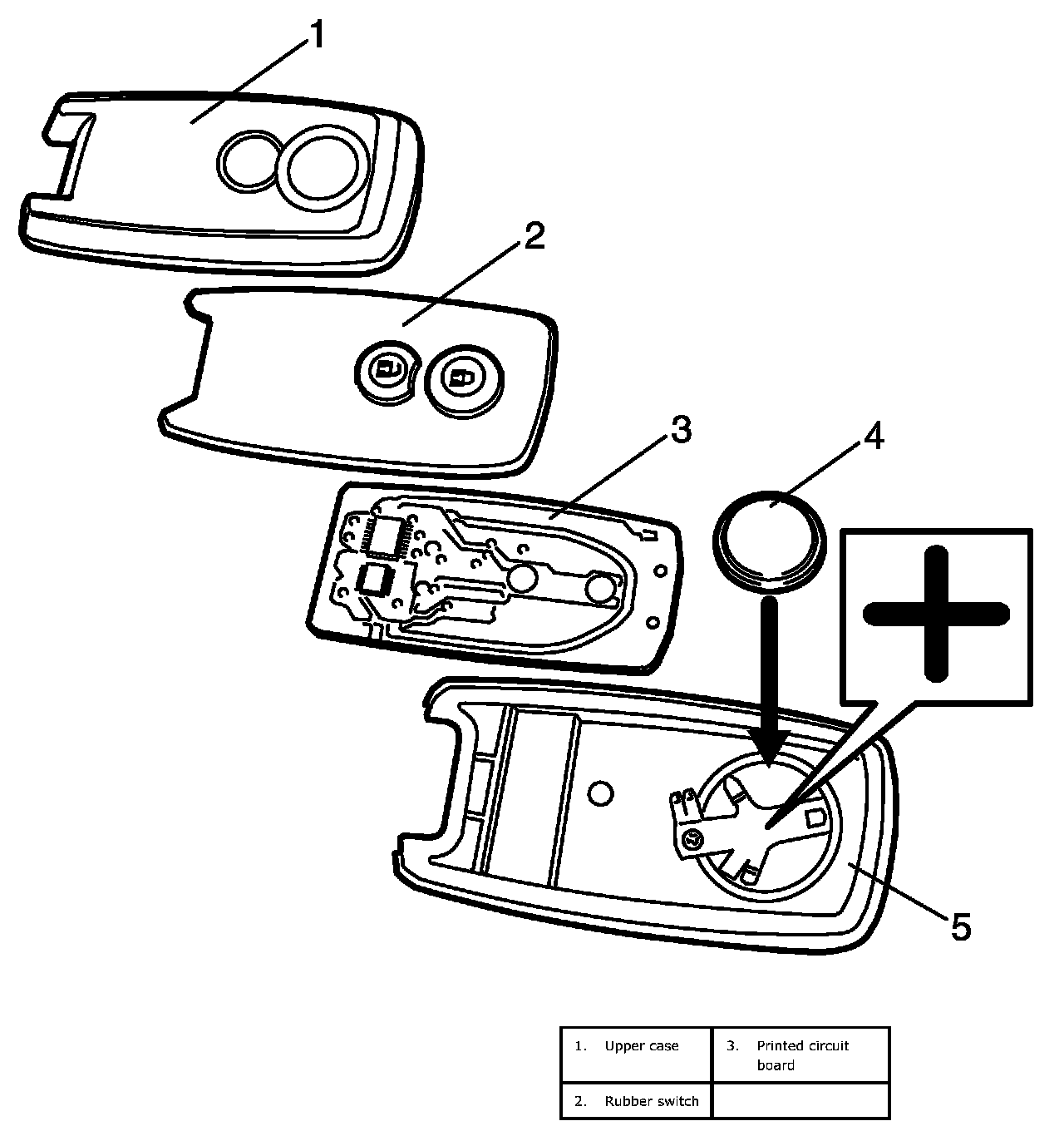 5. Install printed circuit board and rubber switch to upper case and then fit lower case securely.
