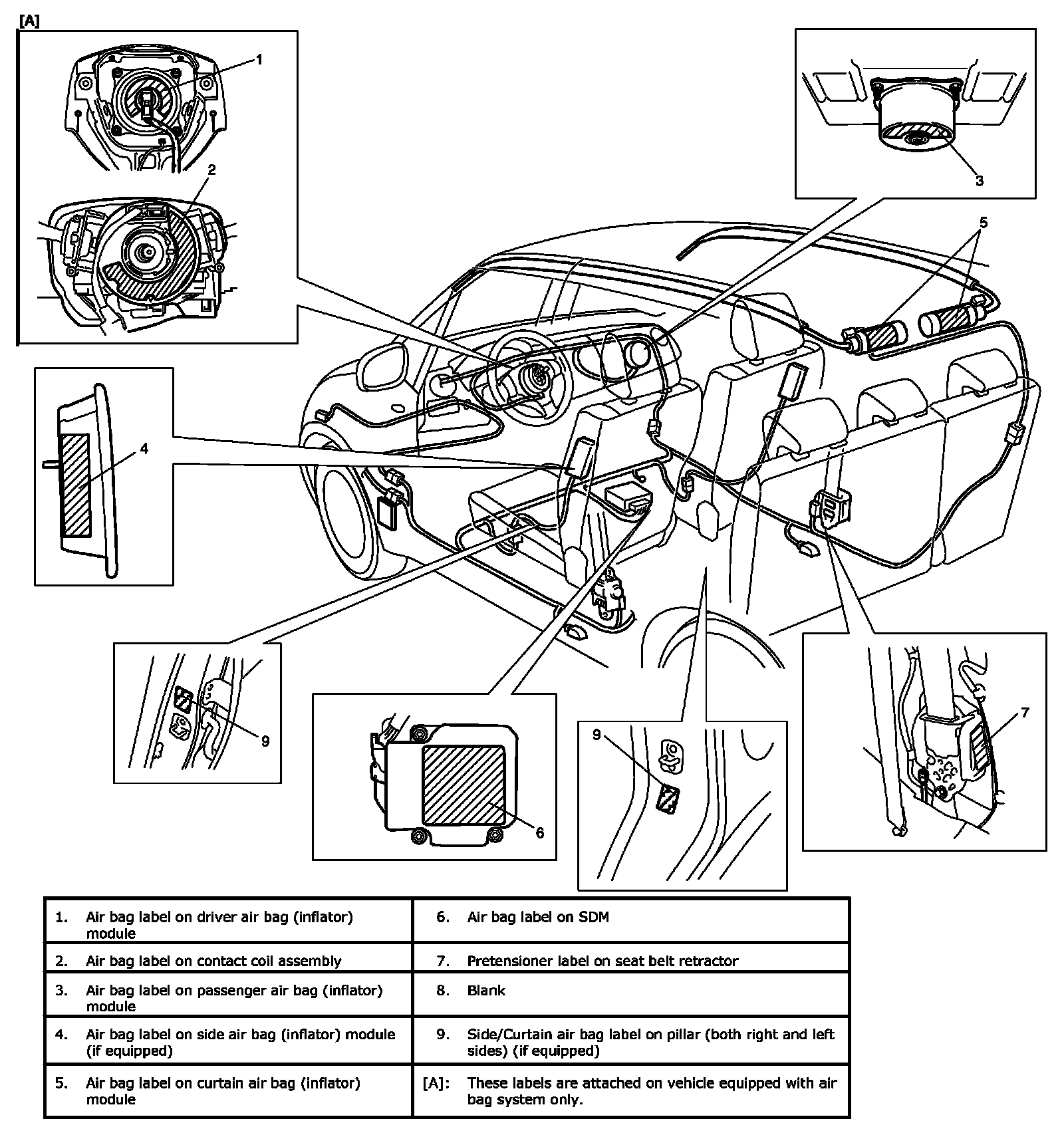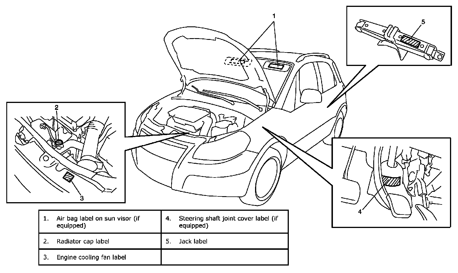 Warning, Caution And Information Labels LocationThe figure shows main labels among others that are attached to vehicle component parts. When servicing and handling parts, refer to WARNING / CAUTION instructions printed on labels. If any WARNING / CAUTION label is found stained or damaged, clean or replace it as necessary.