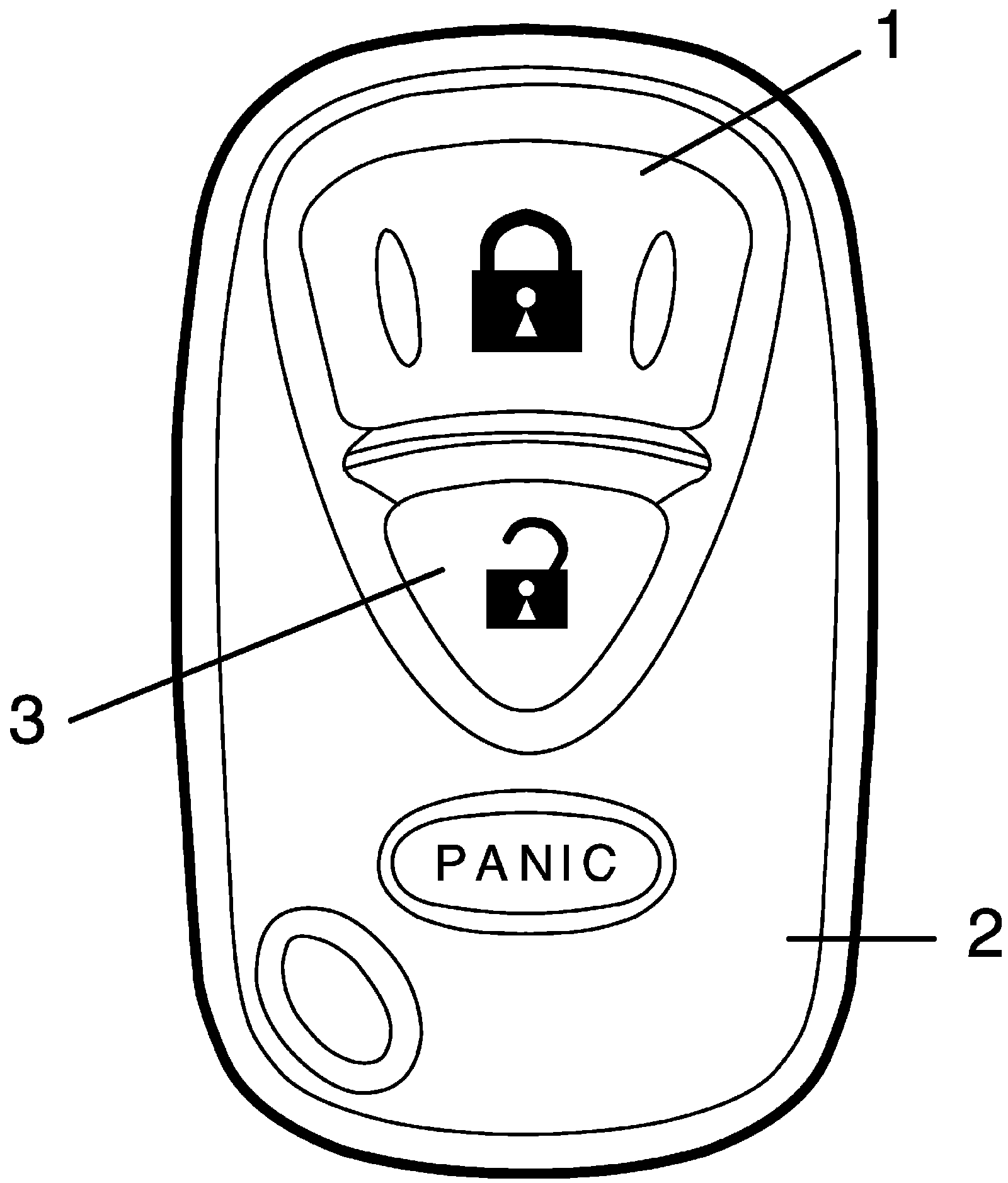 a. Push "lock" button (1) on transmitter (2) or remote controller once, and check all doors lock and hazard waning lights flash once.