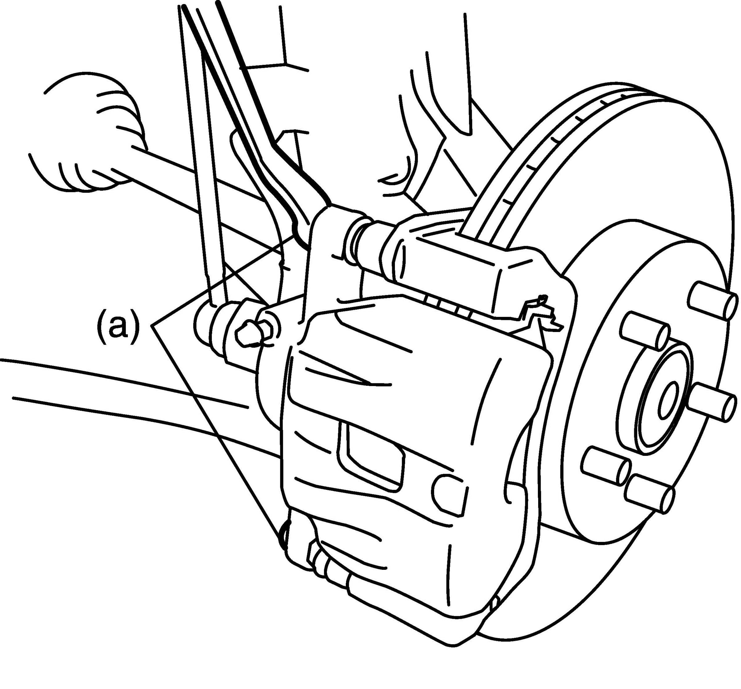 NOTE: Hang removed caliper (1) with a wire hook (4) or the like so as to prevent brake hose from bending and twisting excessively or being pulled. Don't operate brake pedal with brake pads removed.