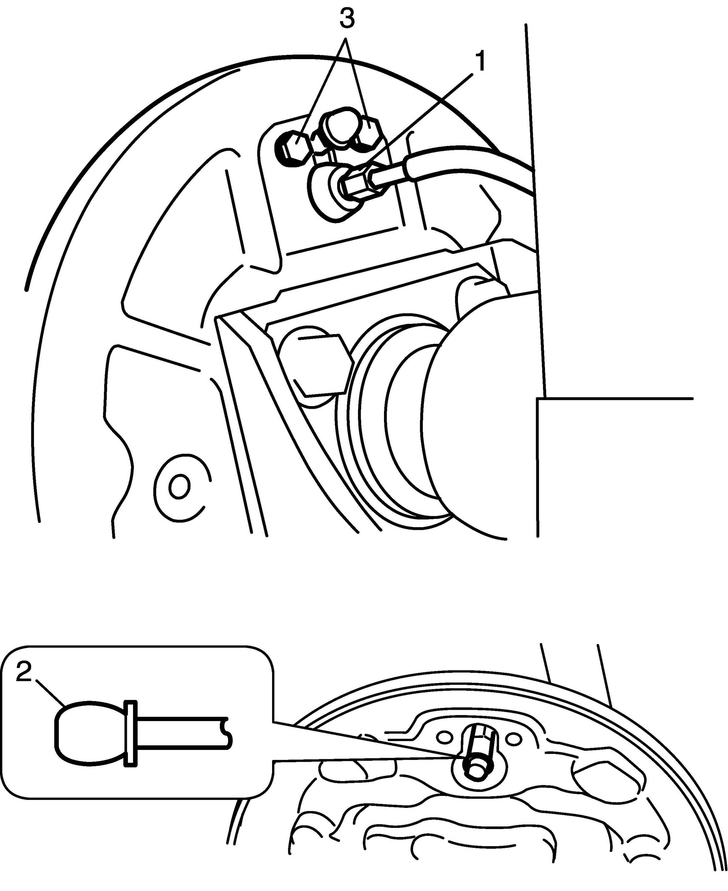 4. Remove wheel cylinder mounting bolt (3). Disconnect brake pipe from wheel cylinder and put bleeder plug cap (2) onto pipe to prevent fluid from spilling.