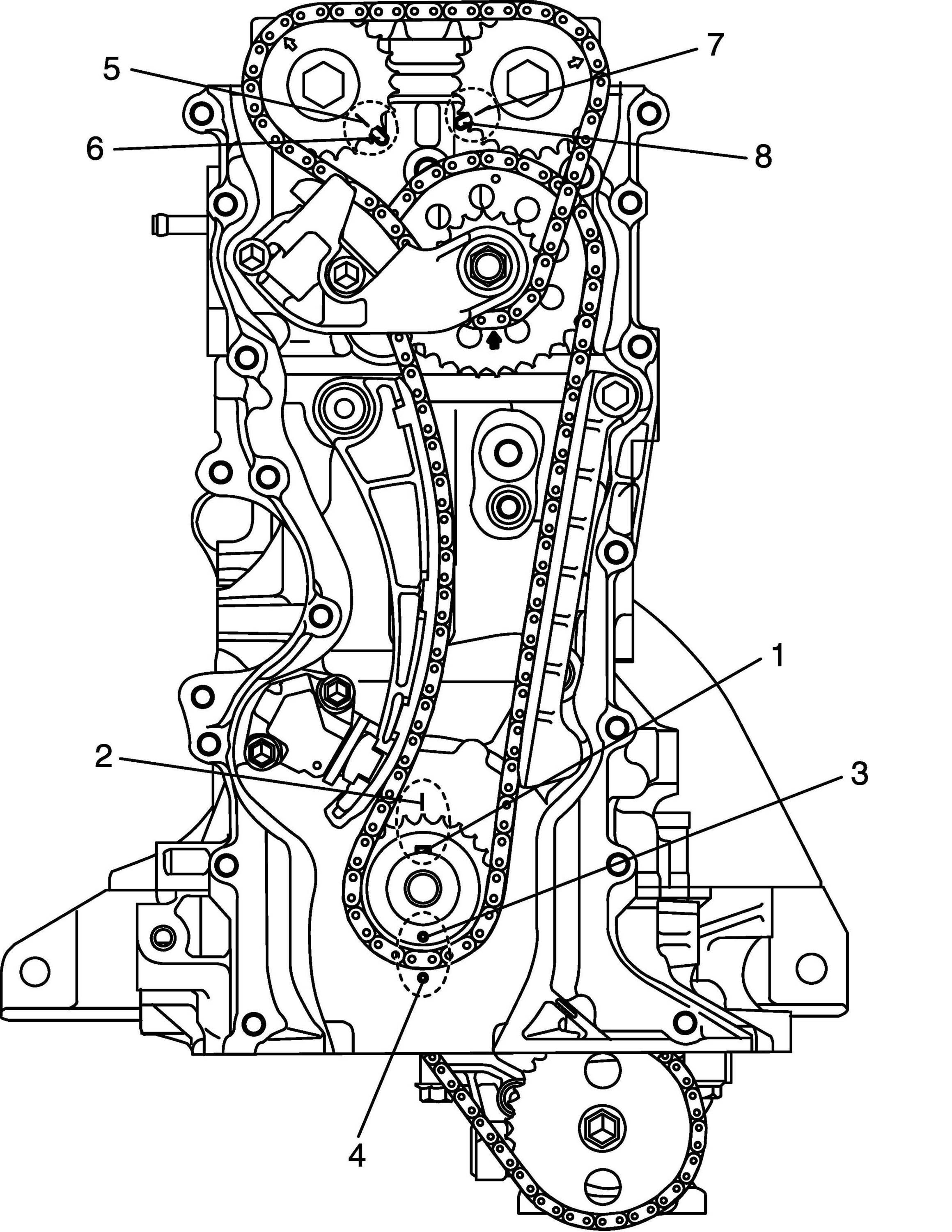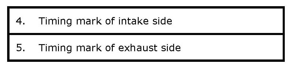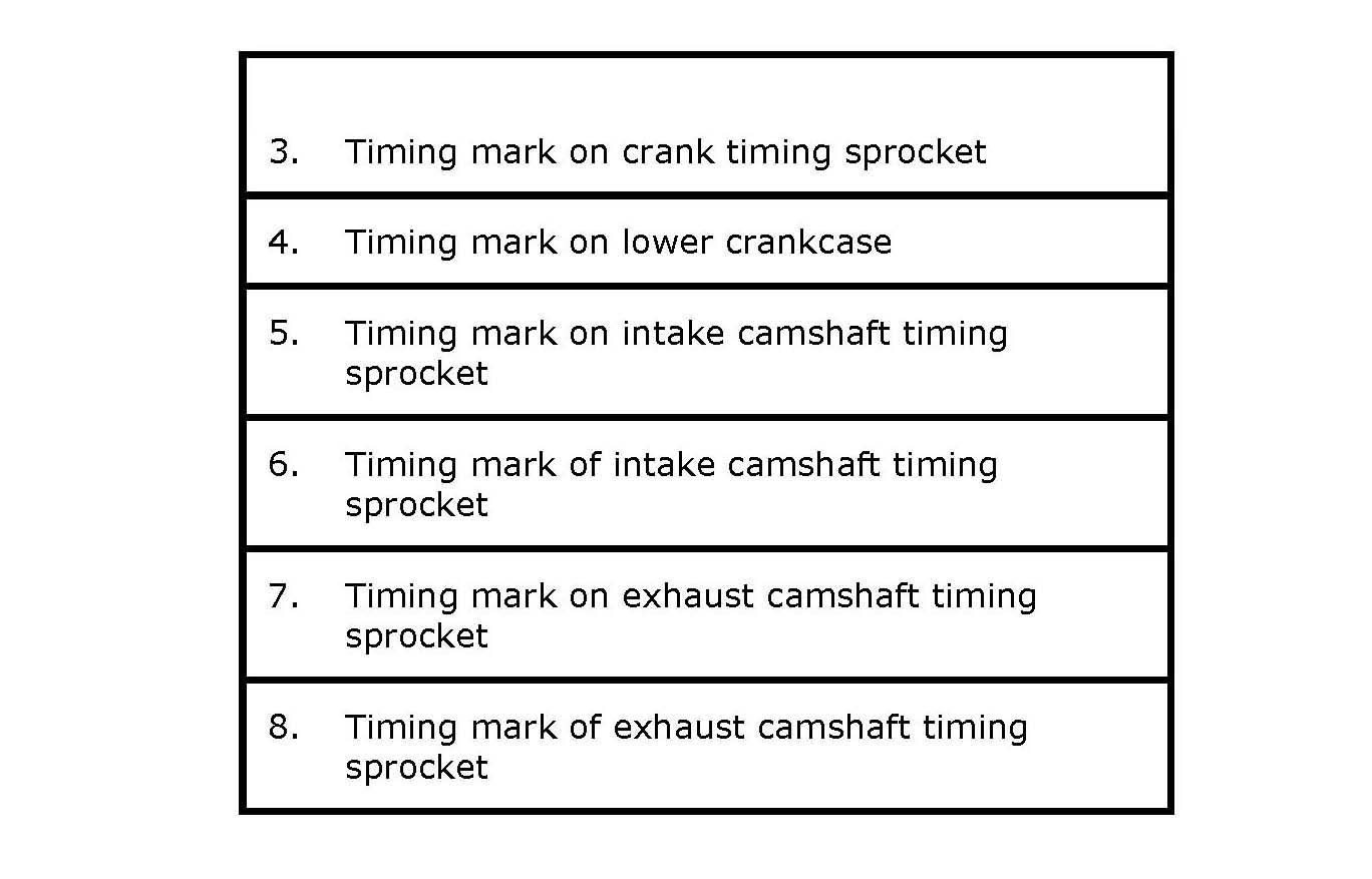 At this time, check timing marks (3, 5 and 7) of sprockets are in match with timing marks (4, 6 and 8) of cylinder head, cylinder block and lower crank case.