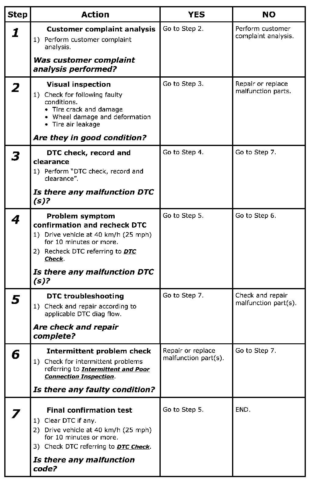 Check if what the customer claimed in "Customer questionnaire" is actually found in the vehicle and if that symptom is found, whether it is identified as a failure. (This step should be shared with the customer if possible.) Check warning light related to TPMS system referring to Low Tire Pressure Warning Light Check. Drive vehicle at 40 km/h (25 mph) for 10 minutes or more and then recheck DTC referring to DTC Check. DTC Check