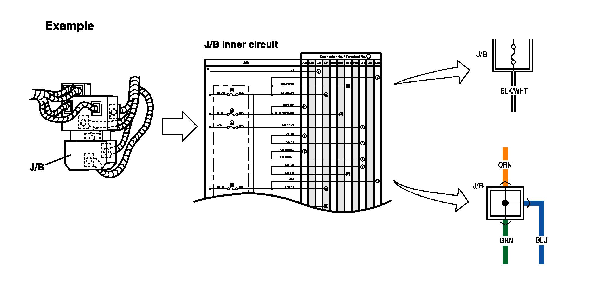^ The joint connector (J/C) connects several different wires with the same wire color at one place instead of connecting them by welding or caulking one by one. It is not an ordinary connector but a part of the continuous wire in the harness.