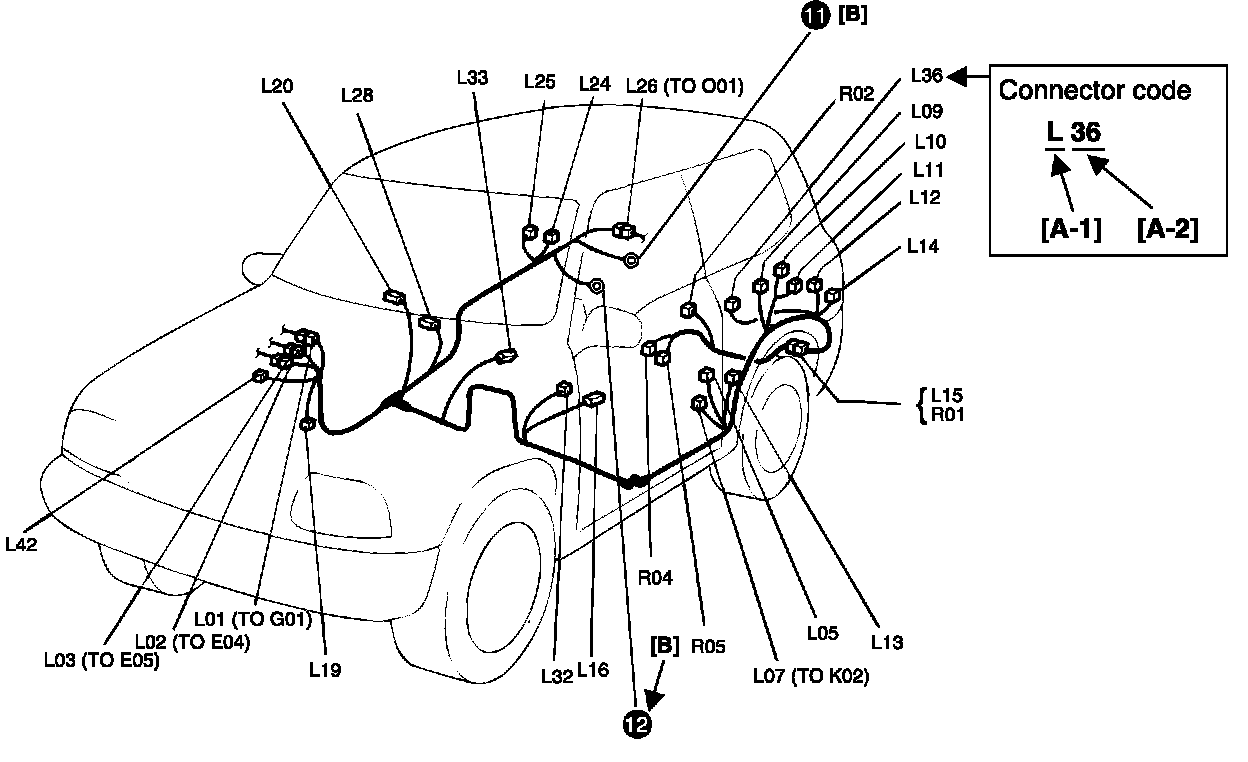 HOW TO READ CONNECTOR LAYOUT DIAGRAM[A-1]: Harness symbol and corresponding harness name