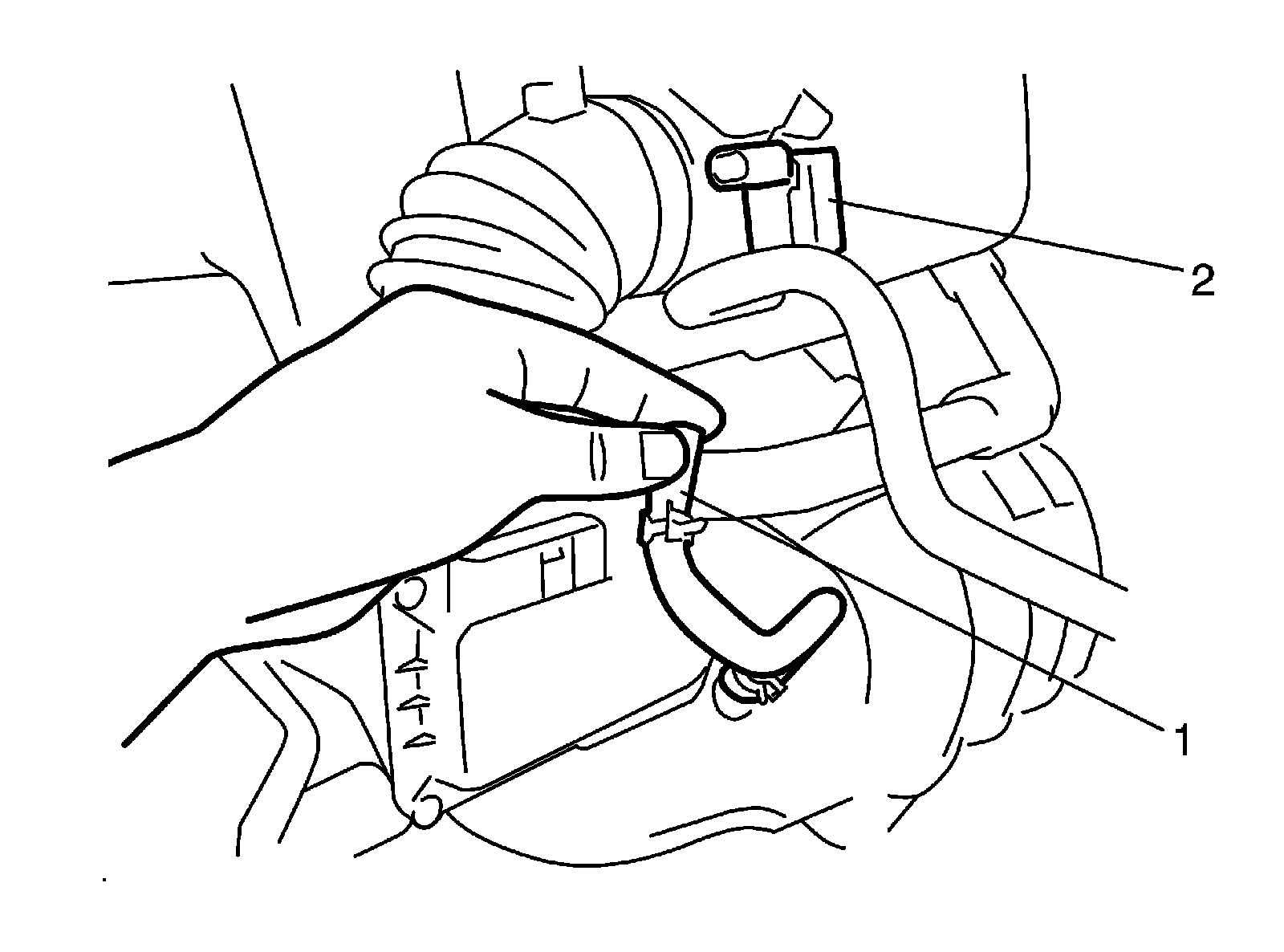 Vacuum Passage InspectionStart engine and run it at idle speed. Disconnect purge hose No.3 (1) from EVAP canister purge valve (2). With finger placed against disconnected hose, check that vacuum is applied.