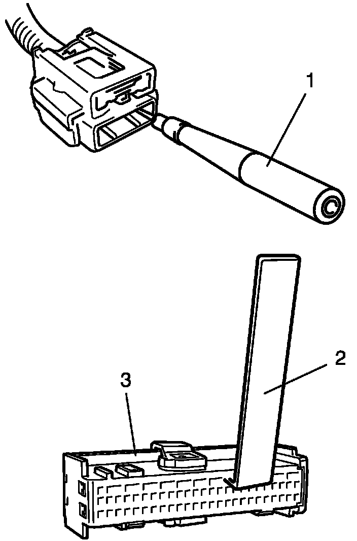 The adapter (1) will also give an idea of whether or not contact tension is sufficient, helping to find an open or intermittent open due to poor terminal contact. An SDM short bar release tool (2) is included in the connector test adapter kit. Inserting it into the SDM connector (3) will releases the shorting bar.