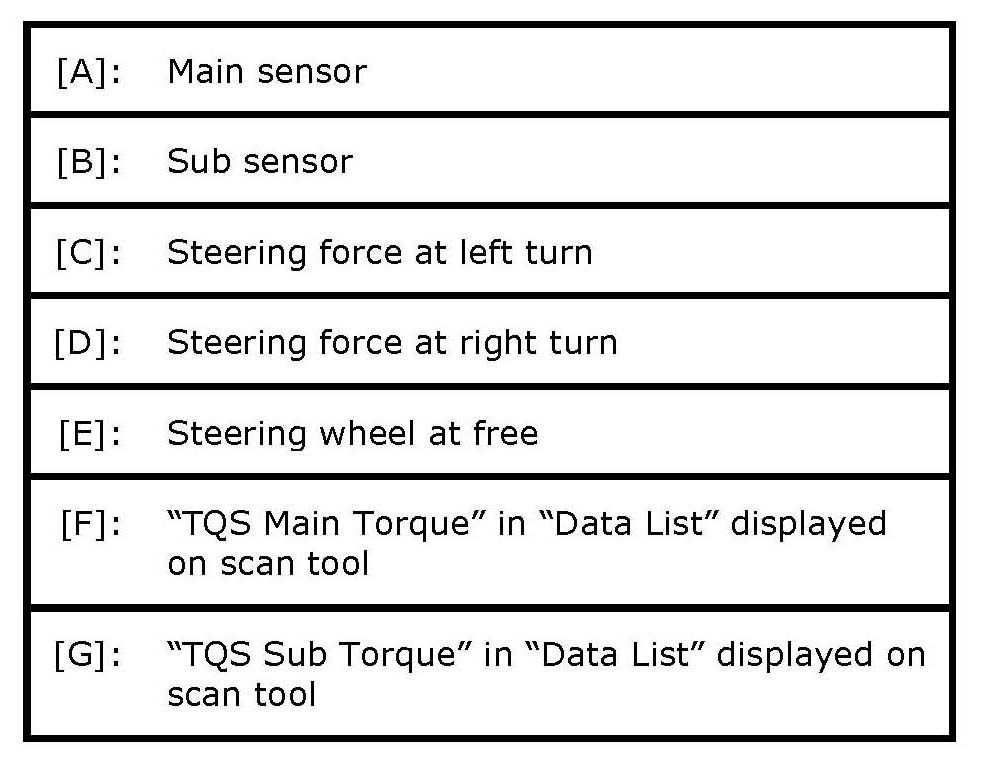5. Turn ON ignition switch without engine running and select scan tool "Data List" mode due to checking "TQS Main Torque" and "TQS Sub Torque" displayed on scan tool when steering wheel turned left and right (if used).
