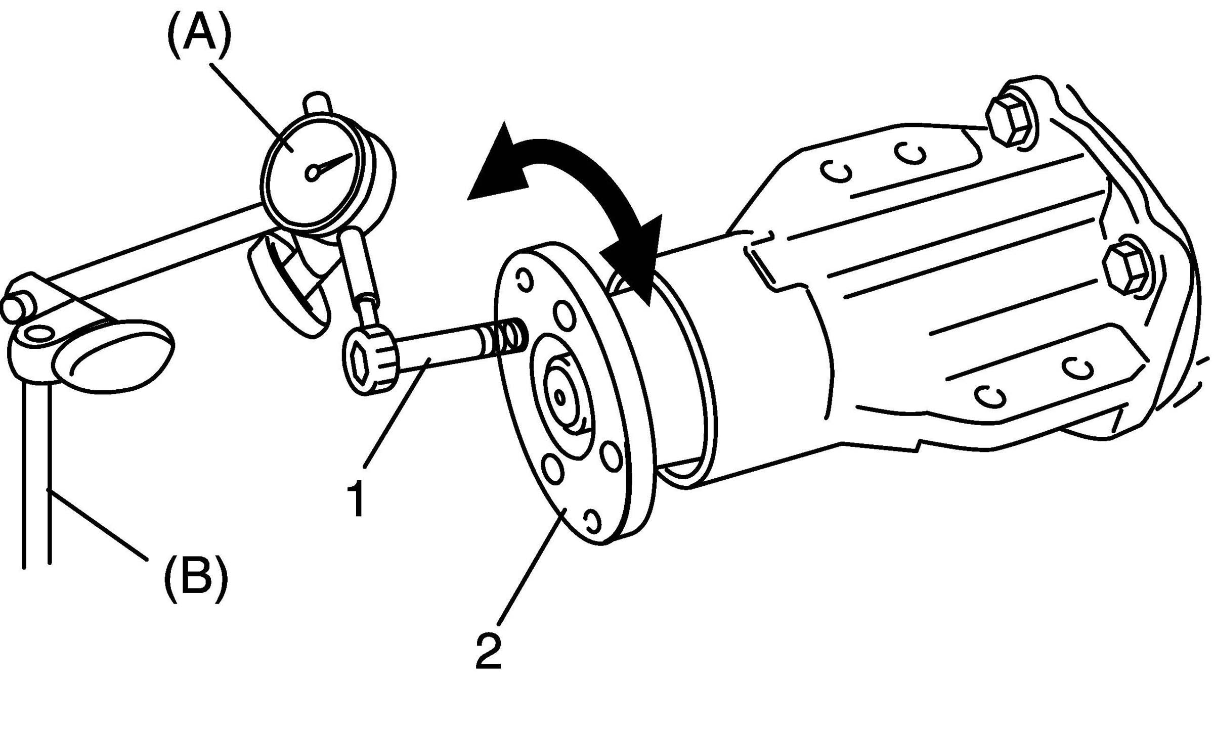 8. Install bolt to bolt hole of flange (2), set dial gauge measuring tip at right angles to bolt (1) as shown in figure. Holding reduction driven gear by hand, take measurement backlash of pinion and bevel gear.