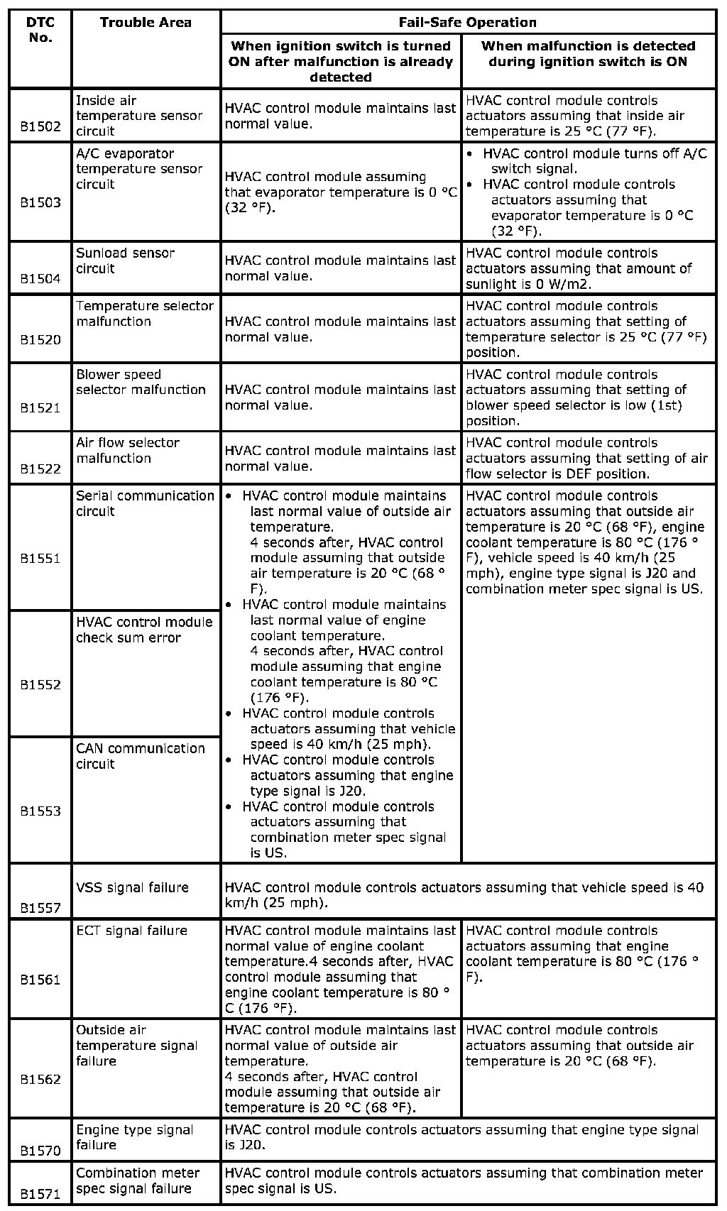 When any of the following malfunctions (DTCs) is detected, fail-safe mode is activated. However, when HVAC control module detects normal operation of A/C system, fail-safe mode is canceled.