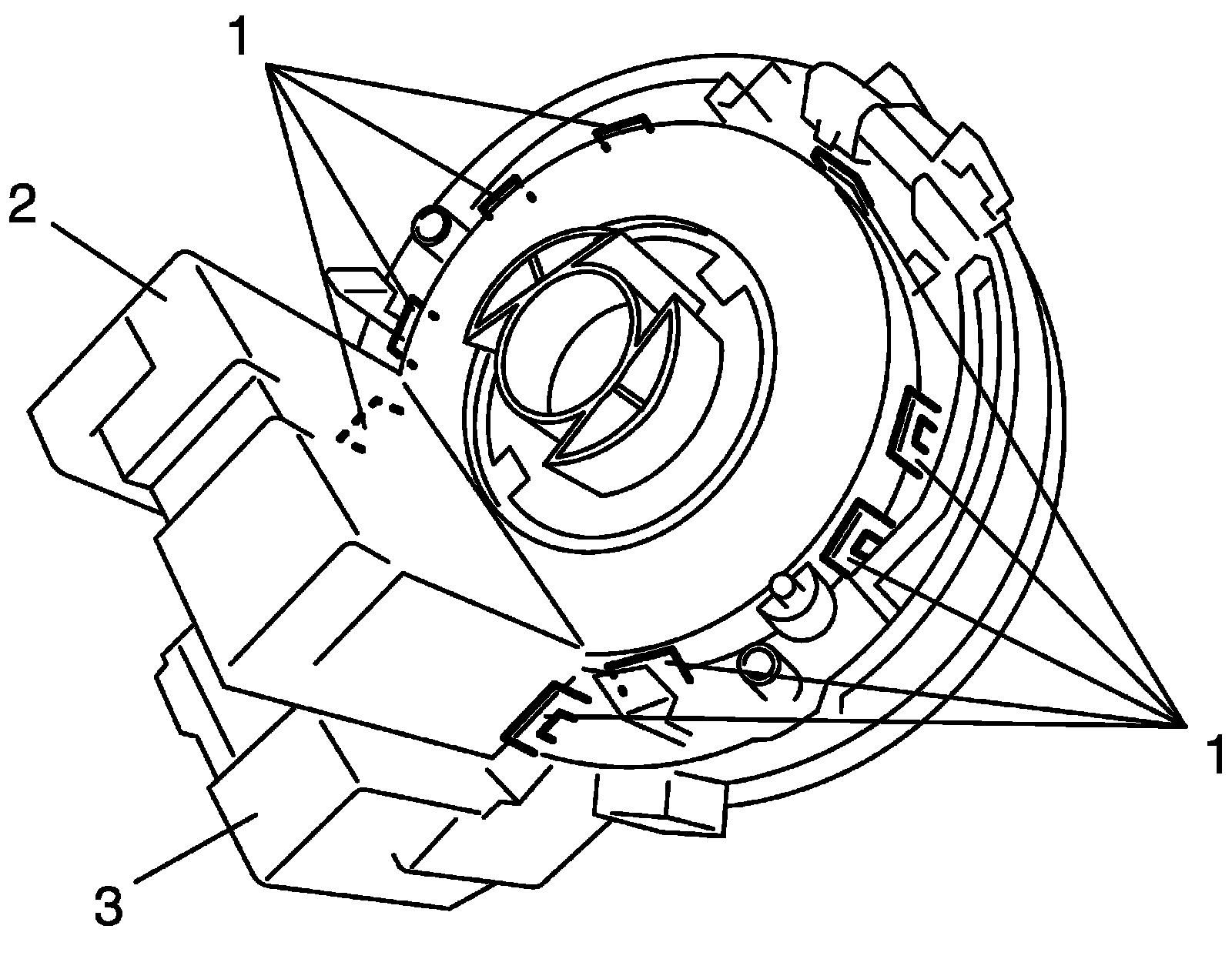 2. Remove steering angle sensor (2) from contact coil cable assembly (3) while opening fitting parts (1) of contact coil cable assembly.