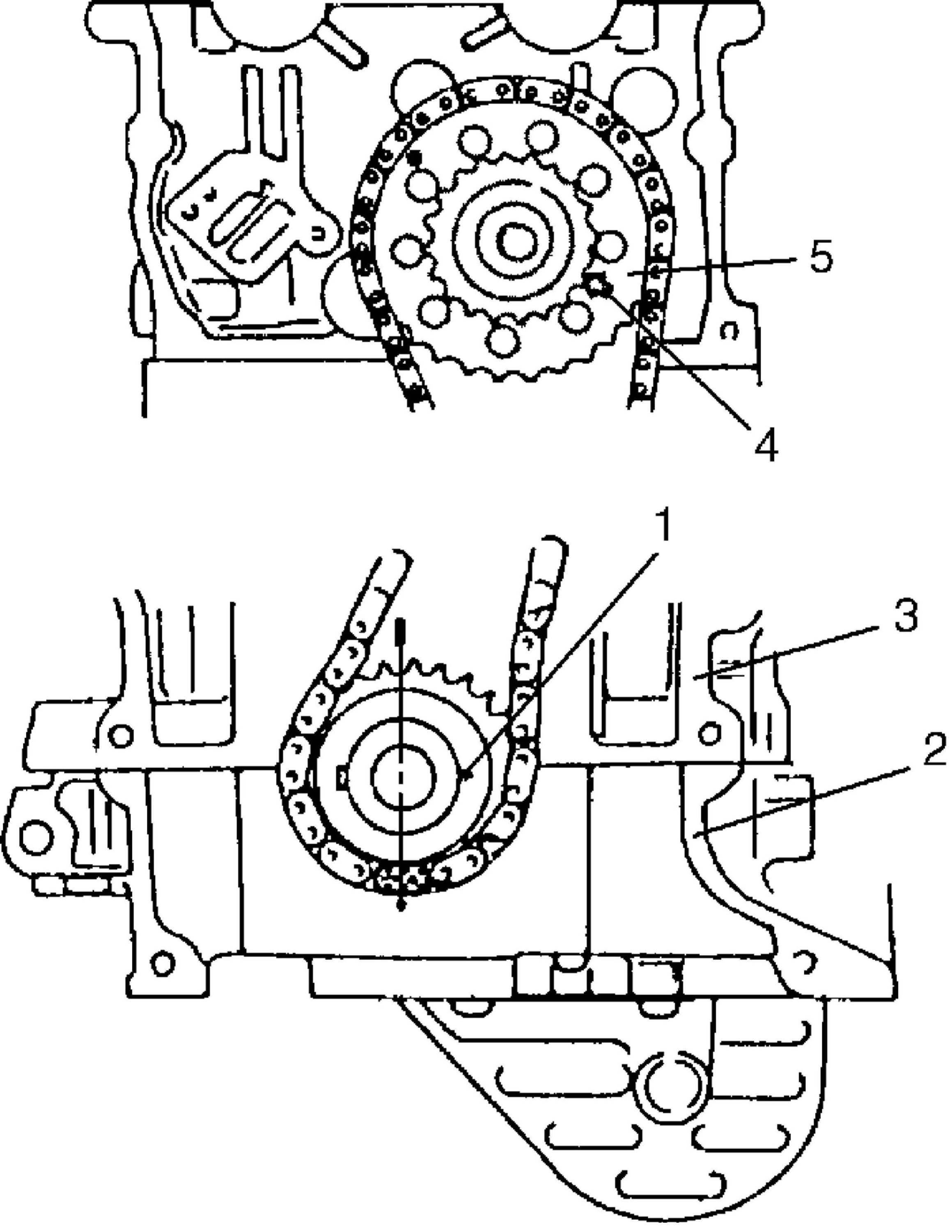 2. Match match mark (1) on crank timing sprocket and mating surface of cylinder block (3) and lower crankcase (2) as shown in figure.