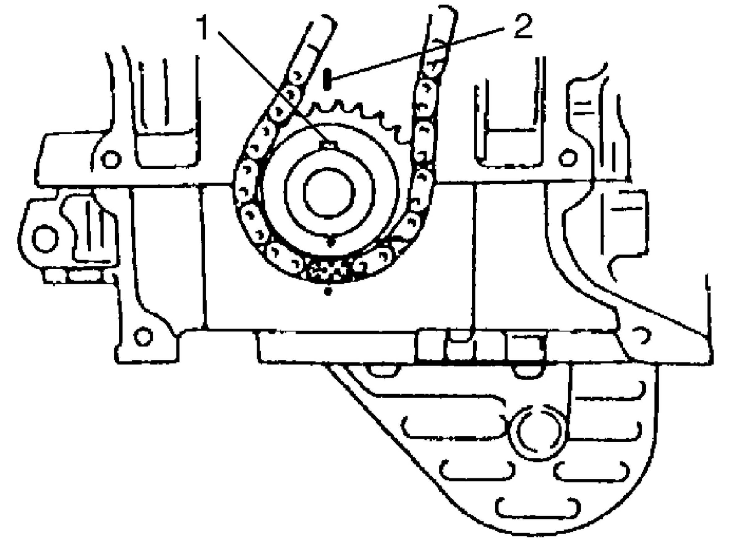 7. Turn crankshaft clockwise then align crankshaft timing sprocket key (1) with timing mark (2).