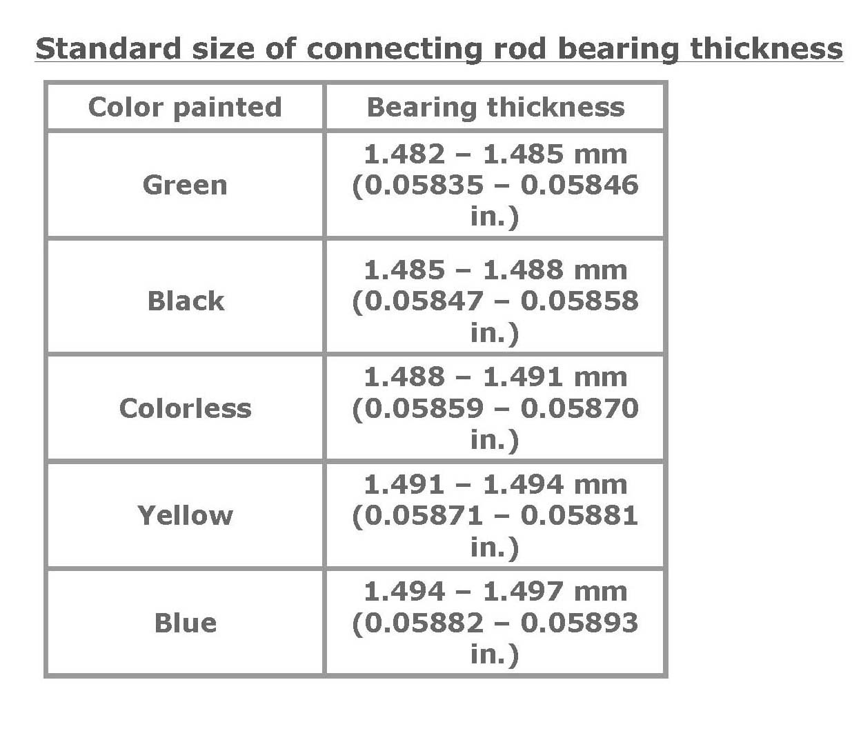 c. There are 5 kinds of standard bearings differing in thickness. To distinguish them, they are painted in the following colors at the position as indicated in the figure. Each color indicated the following thickness at the center of bearing.