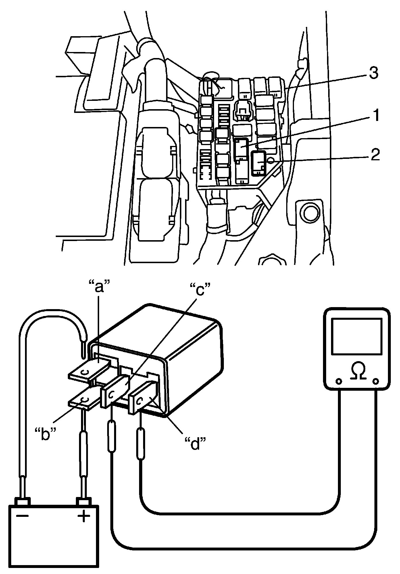 4. Connect battery positive (+) terminal to terminal "b" of relay and battery negative (-) terminal to terminal "a" of relay, and then check continuity between terminal "c" and "d". If there is no continuity, replace relay.
