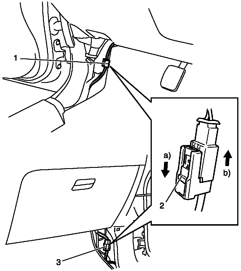 6. Remove passenger side front pillar lower trim and disconnect yellow connector (3) for passenger air bag as follows.