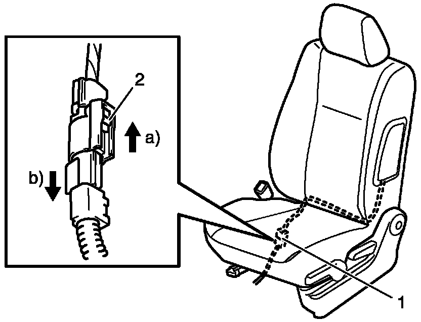 7. Disconnect yellow connector of side-air bag (inflator) module under front seat cushion (1).
