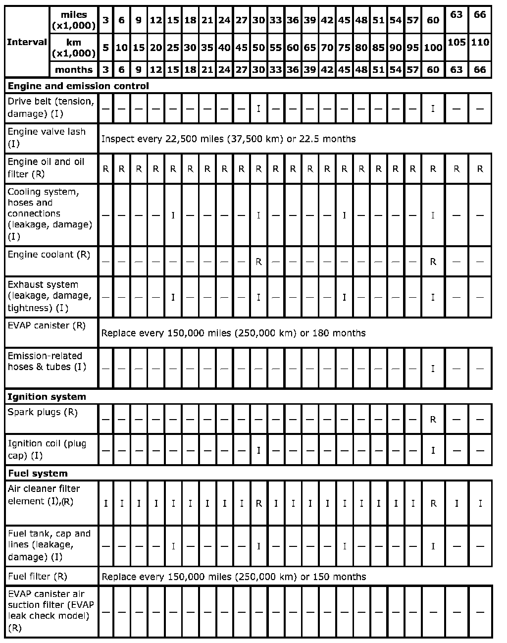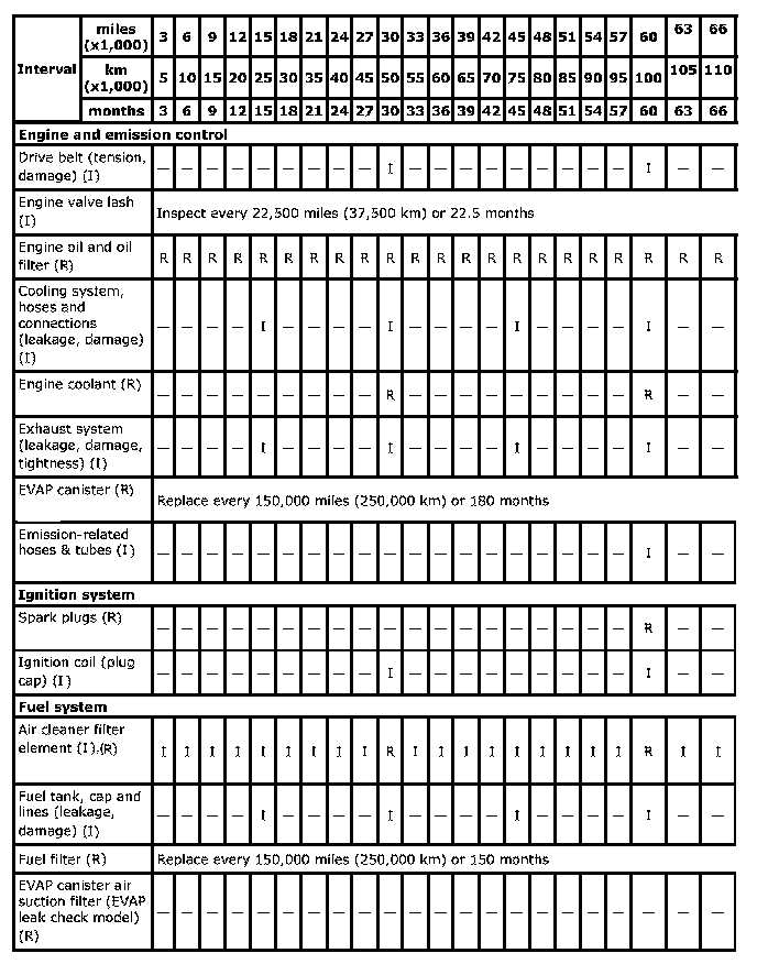 ^ This table includes service as scheduled up to 75,000 miles (125,000 km) mileage. Beyond 75,000 miles (125,000 km), carry out the same services at the same intervals respectively.