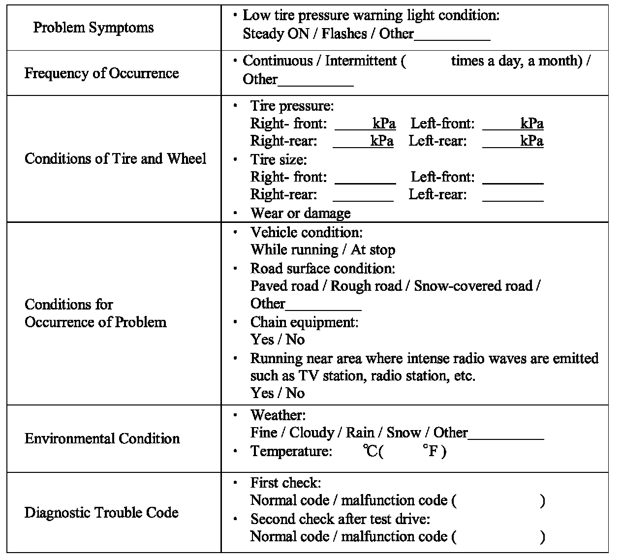Record details of the problem (failure, complaint) and how it occurred as described by the customer. For this purpose, use of such a questionnaire form as shown in the figure will facilitate collecting information to the point required for proper analysis and diagnosis.