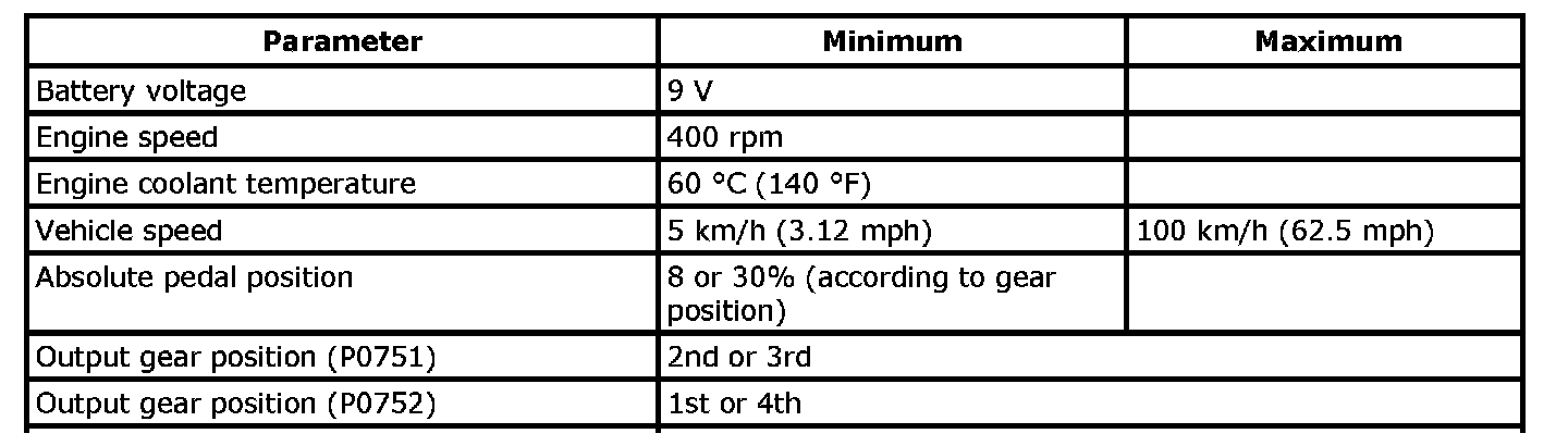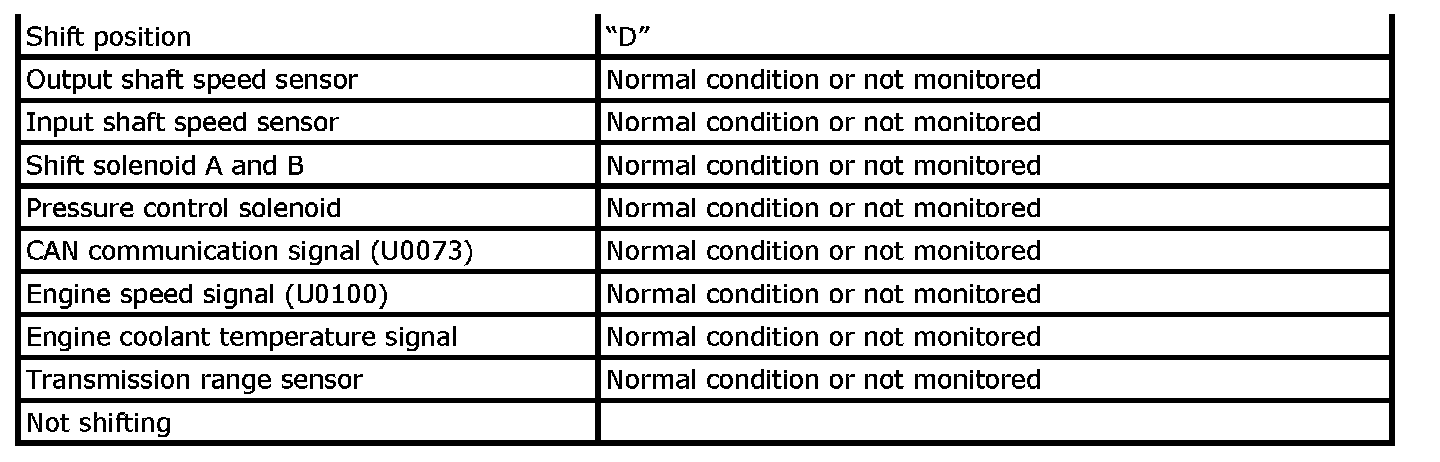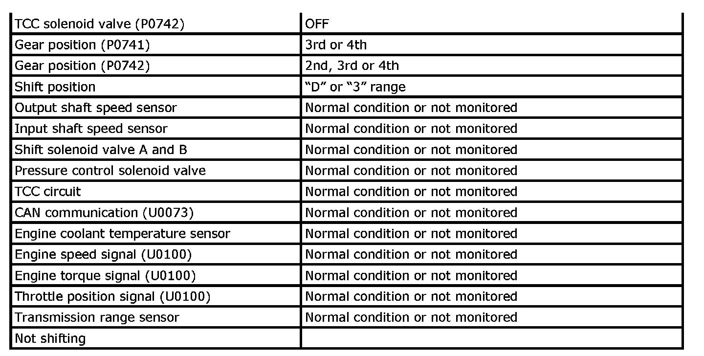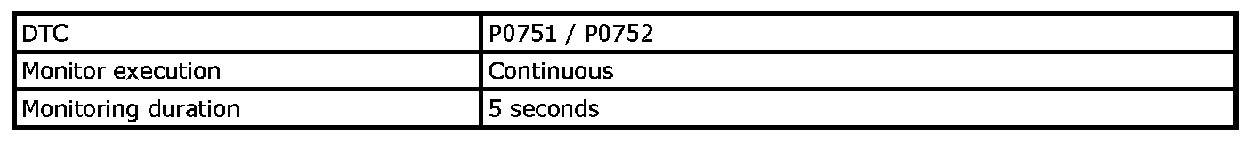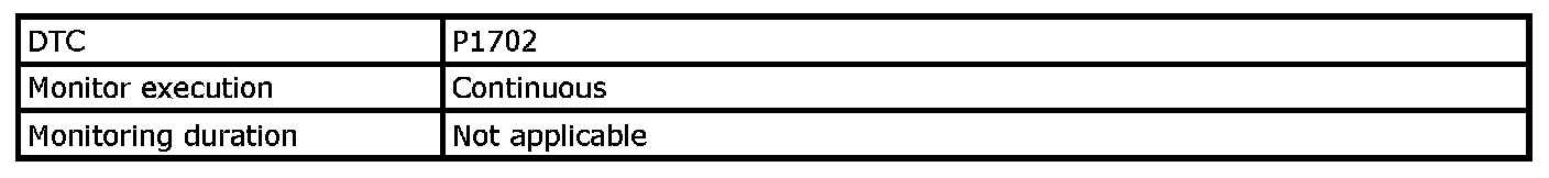 Input signal of transmission range sensor (P0705), transmission fluid temperature sensor (P0711), input shaft speed sensor (P0717), output shaft speed sensor (P0722), TCC lock-up solenoid valve (P0741, P0742), shift solenoid valve (P0751, P0752, P0756, P0757), pressure control solenoid valve (P0961), TCM (P1702), CAN communication (U0073, U0100) are checked for circuit rationality by monitoring each sensor and vehicle condition.