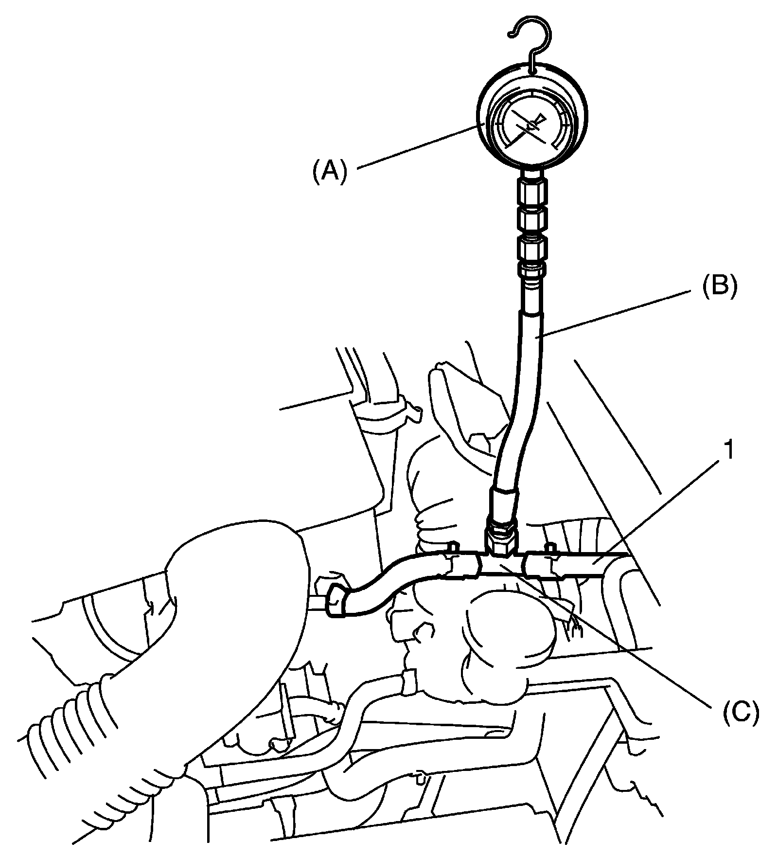 3. Connect special tools and hose between fuel feed hose (1) and fuel delivery pipe as shown in figure, and clamp hoses securely in order to ensure that no leaks occur during checking.