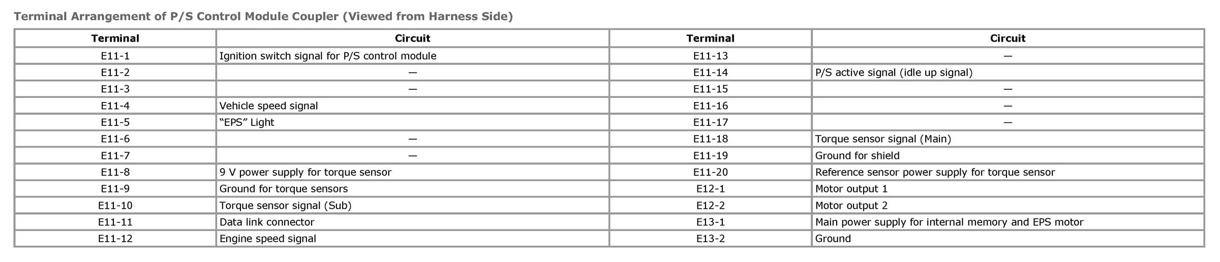 Terminal Arrangement of P/S Control Module Coupler (Viewed from Harness Side)