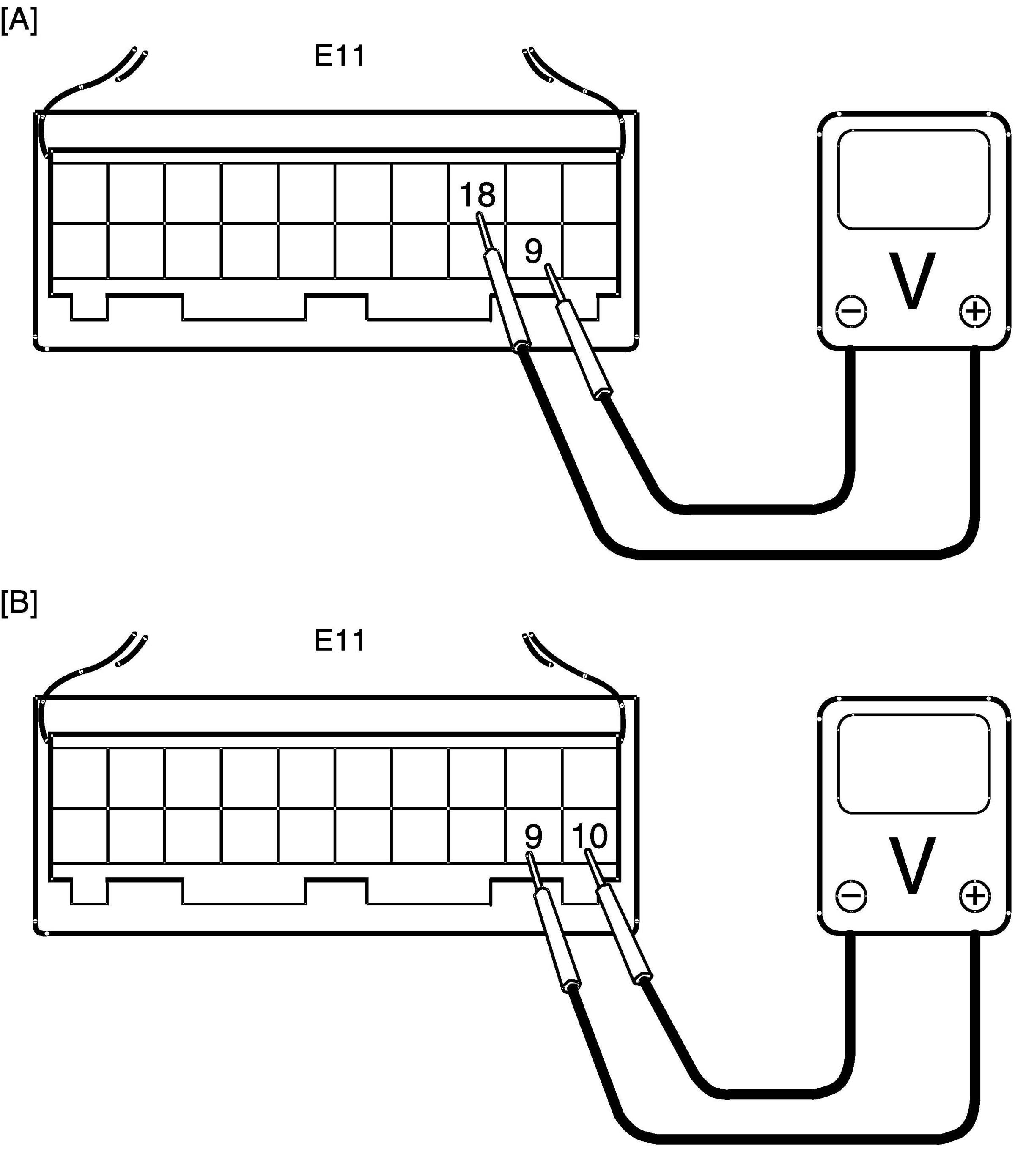 3. With ignition switch turned OFF, connect scan tool to DLC or connect voltage tester between "E11-18"-"E11-9" (main sensor) or "E11-10"-"E11-9" (sub sensor) with connected connector to P/S control module.