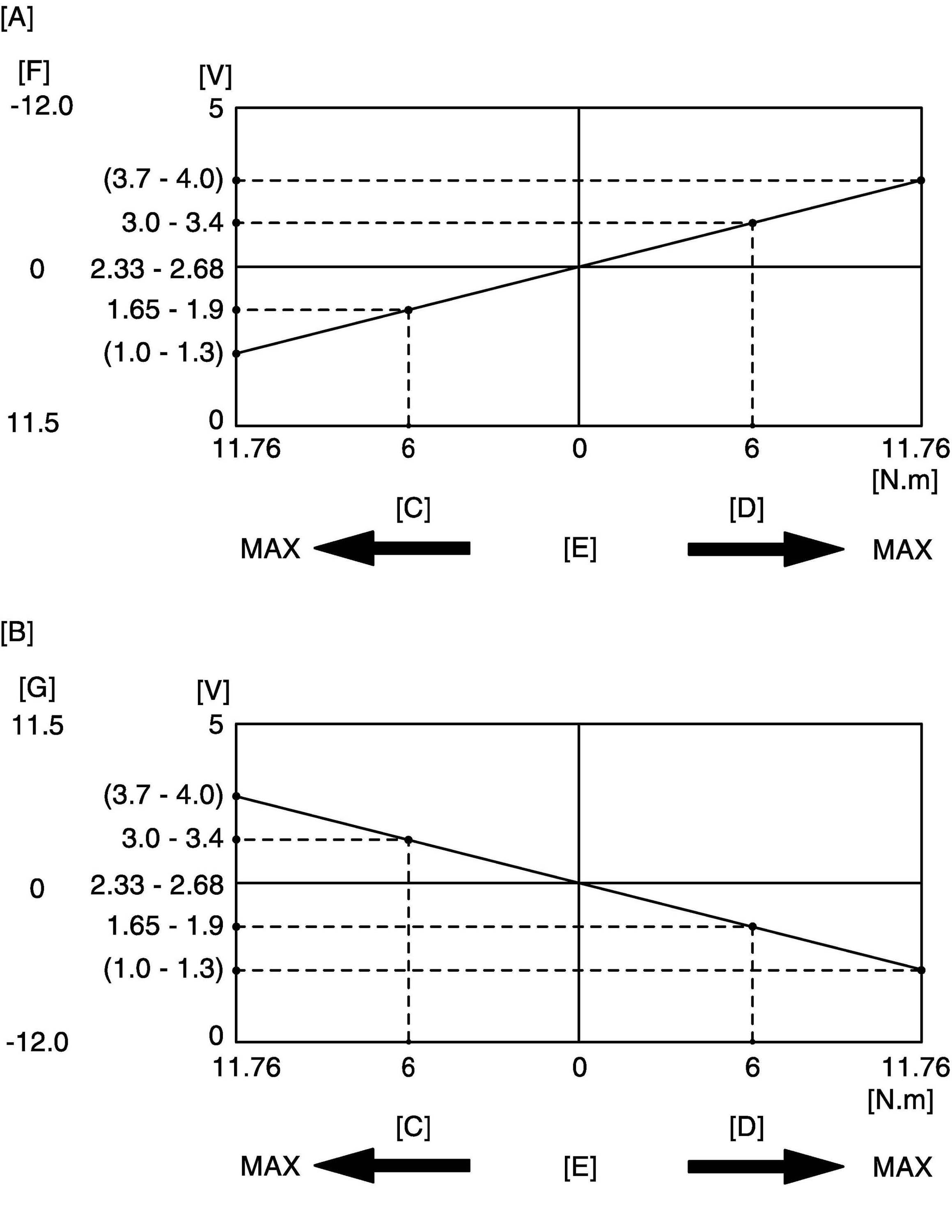 6. Check that characteristic of torque sensor (main and sub) output voltage or scan tool data and steering force is as following graph when steering wheel is turned left and right. If sensor voltage or scan tool data is out of specified value or does not vary linearly as the following graph, check EPS control module and its circuit.