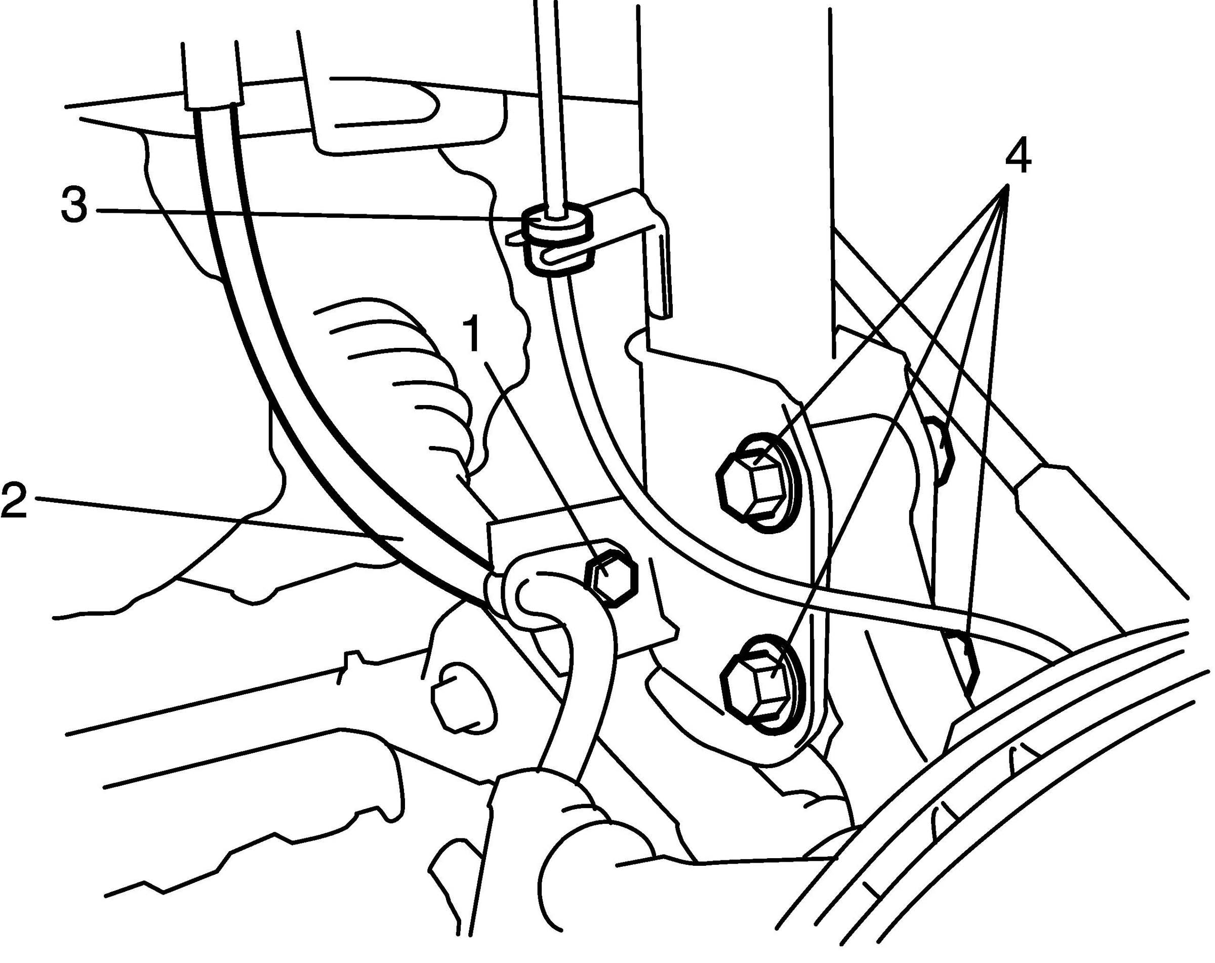 4. Remove brake hose mounting bolt (1). Remove brake hose (2) from bracket and wheel speed sensor harness (3) from strut bracket as shown in figure.