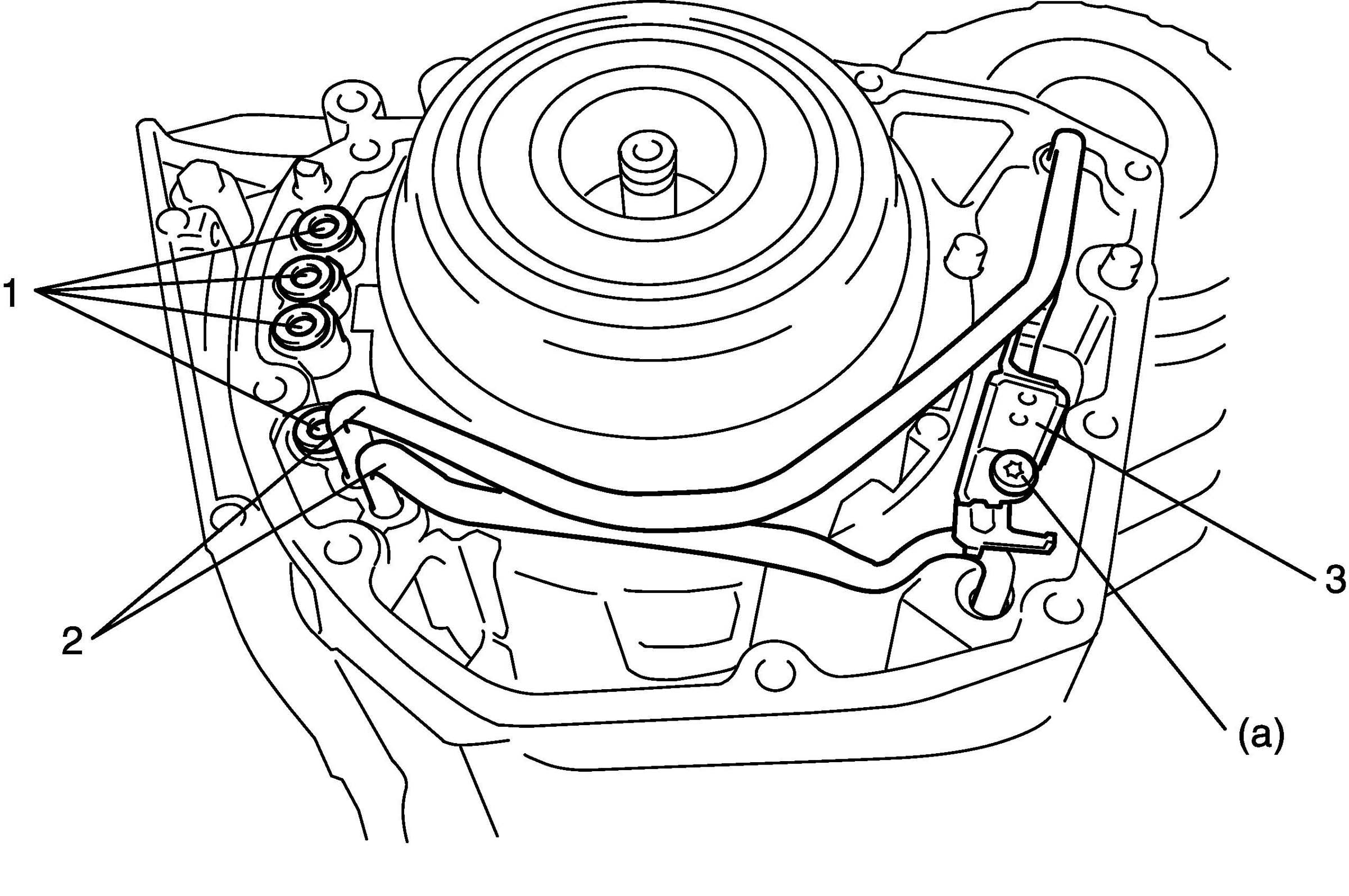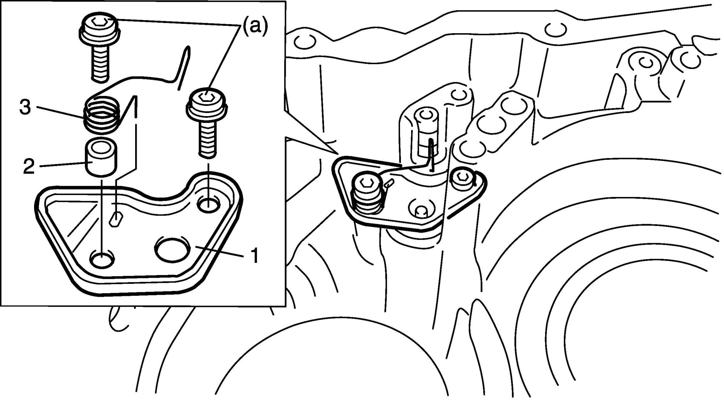 8. Push underdrive brake accumulator cover and install underdrive brake accumulator bracket (1), spacer (2) and torsion spring (3) by tighten 2 torx(R) bolts to specified torque.