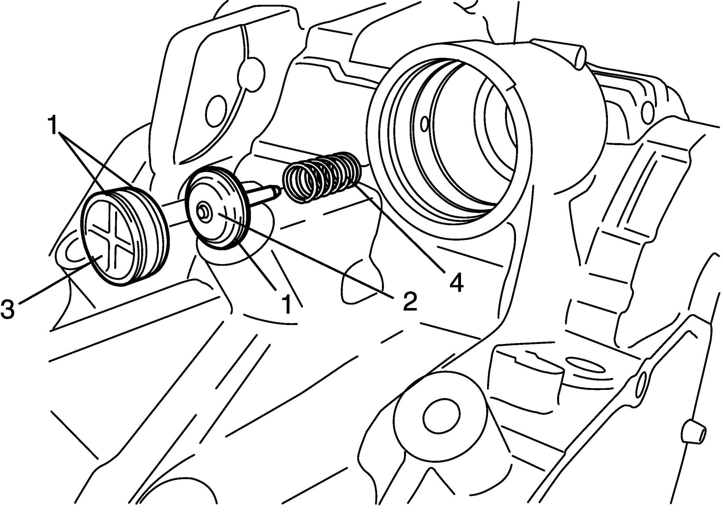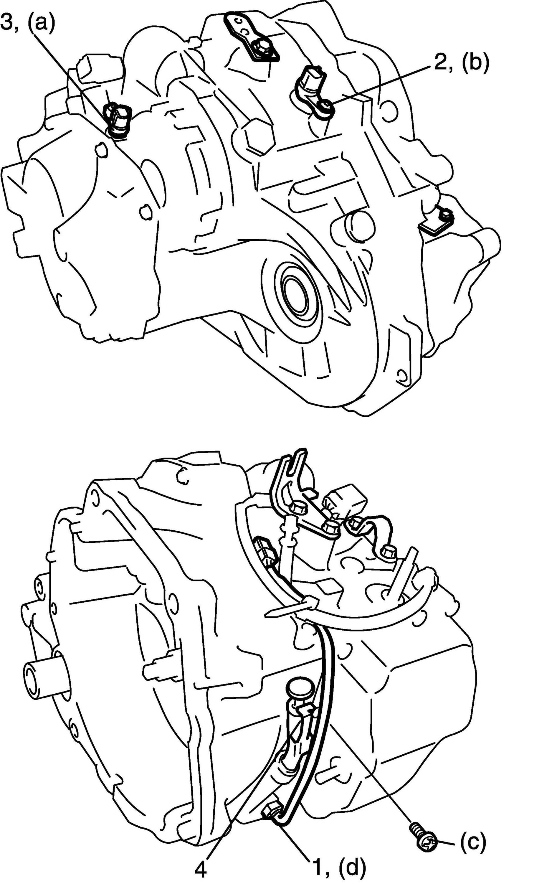 87. Apply A/T fluid to transmission fluid temperature sensor (1), output shaft speed sensor (2), input shaft speed sensor (3) and fluid filler tube (4).