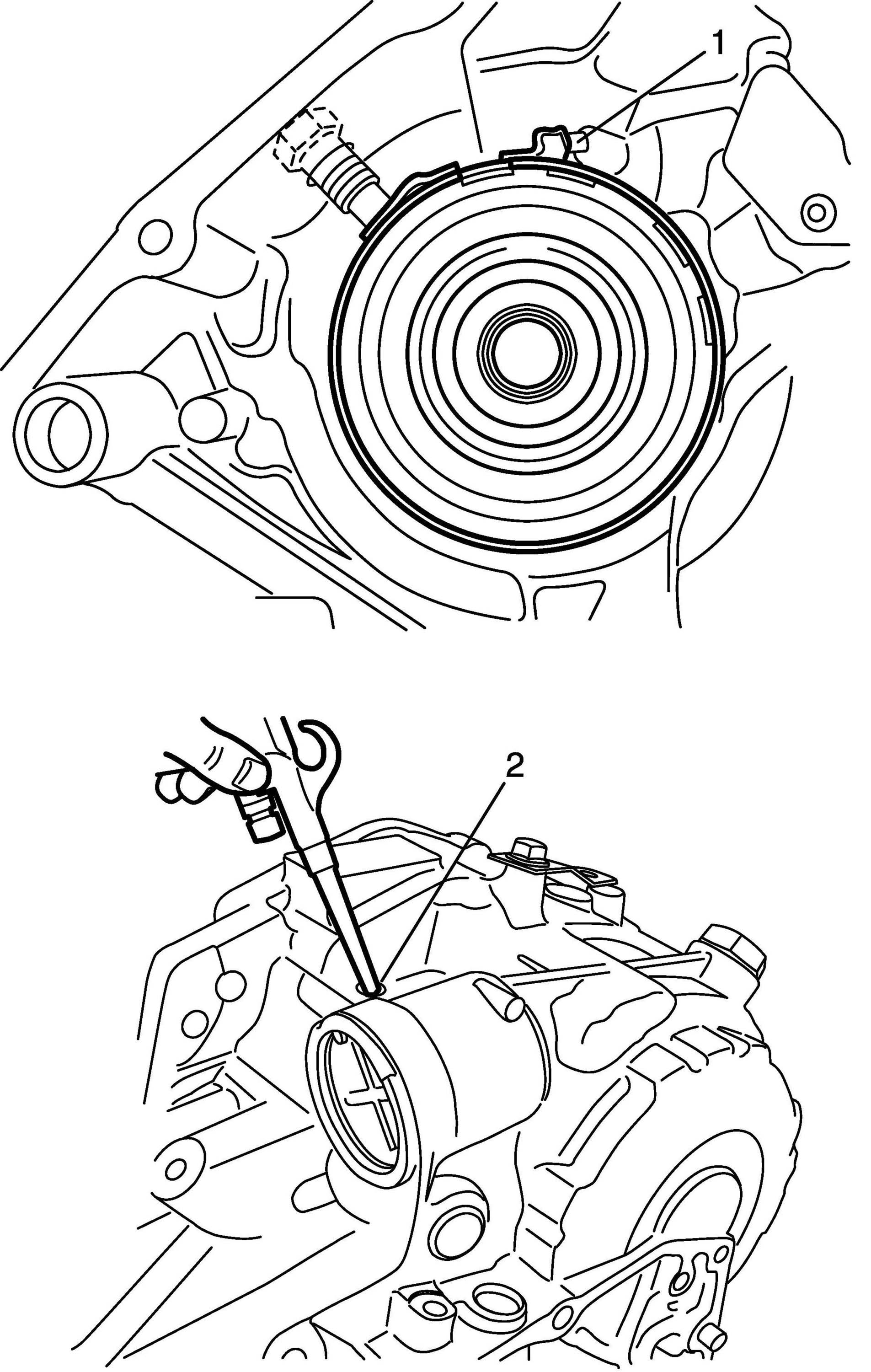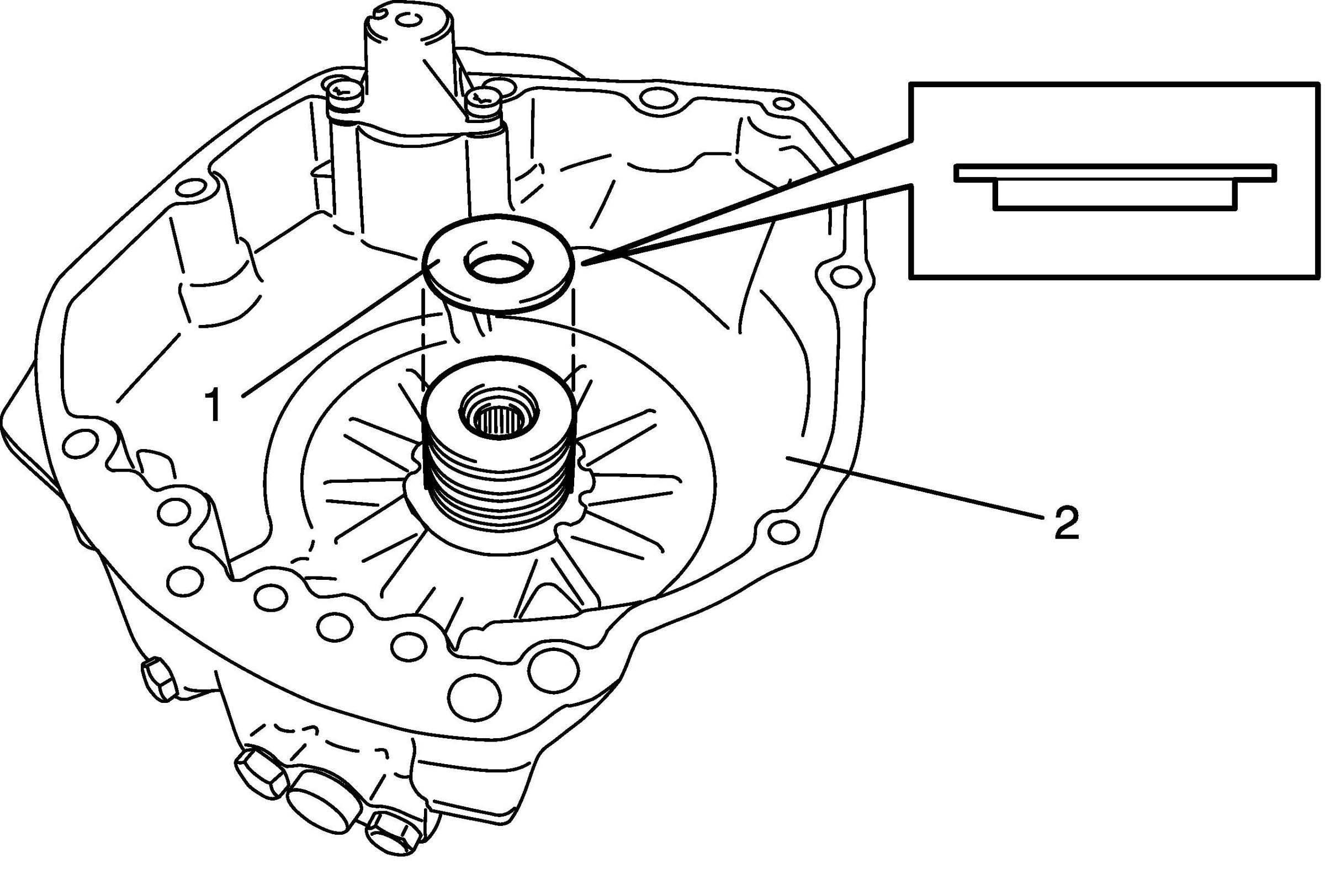 60. Place input shaft rear thrust bearing rear race (1) to transaxle rear cover (2).