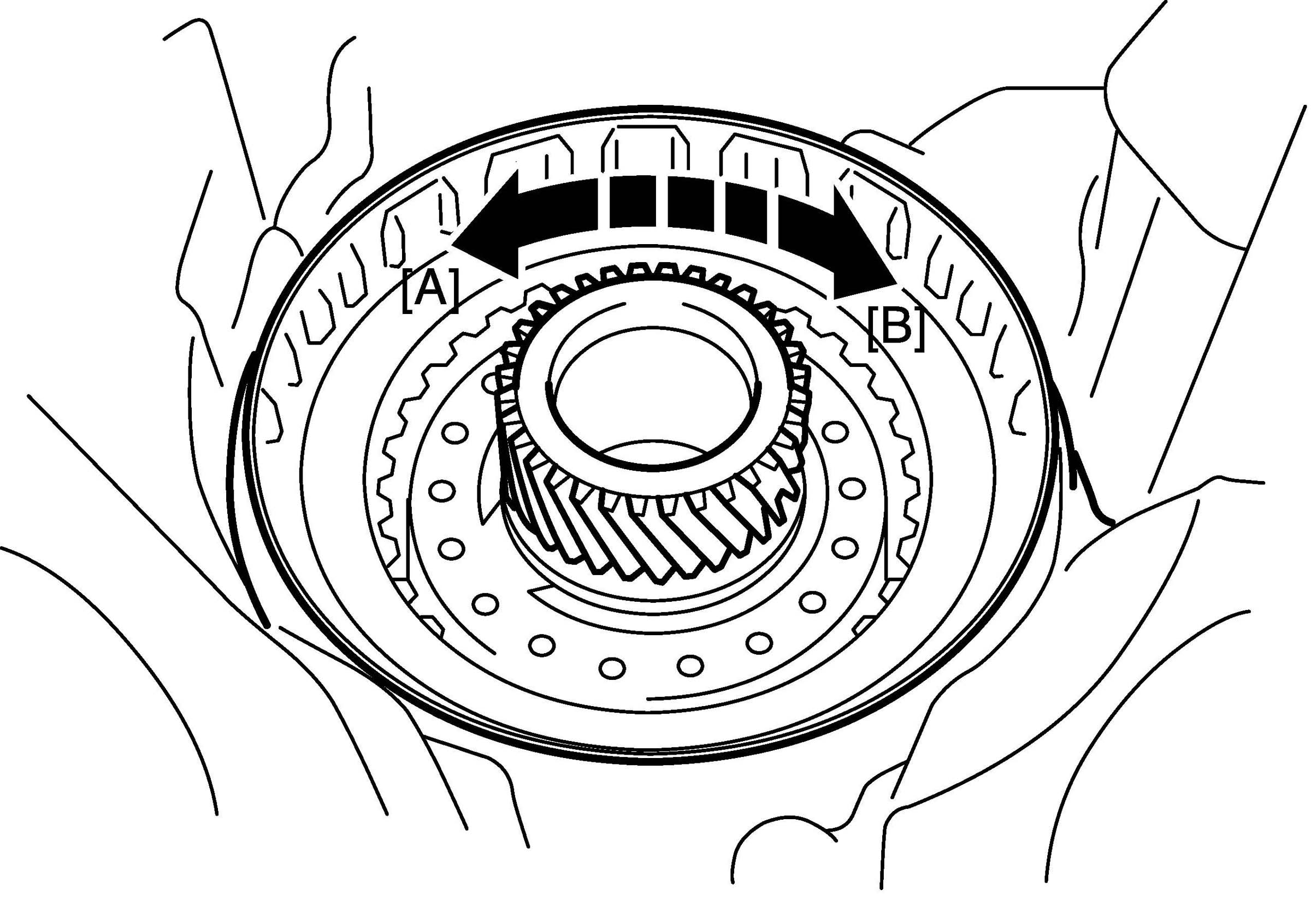 23. Make sure that underdrive clutch turns freely when turned counterclockwise [A] and locks when turned clockwise [B].