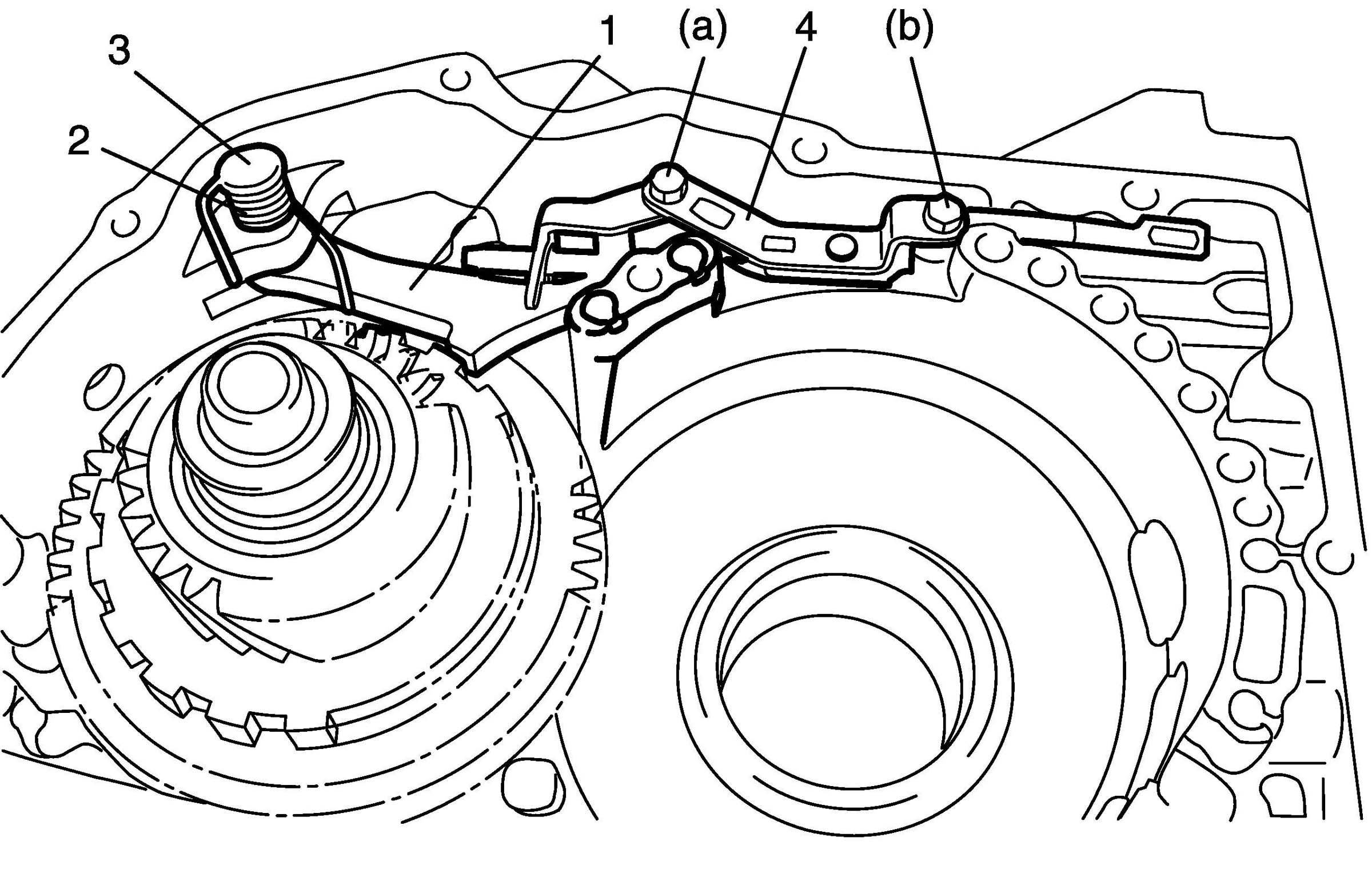 28. Install parking lock pawl bracket and manual detent spring (4) by 2 tightening bolts to specified torque.
