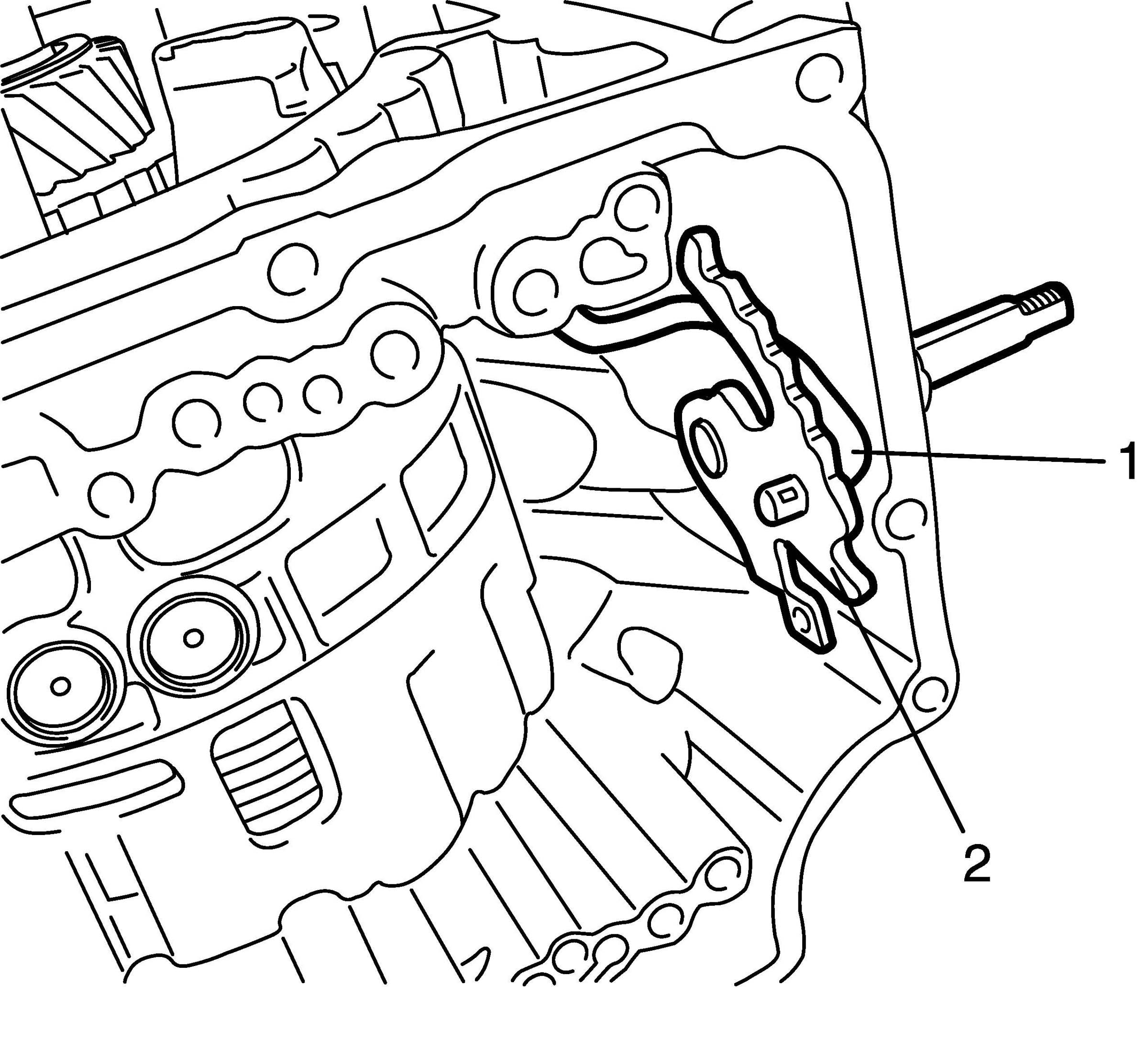 79. While holding valve body assembly, connect manual valve connecting rod (1) to manual shift shaft (2).