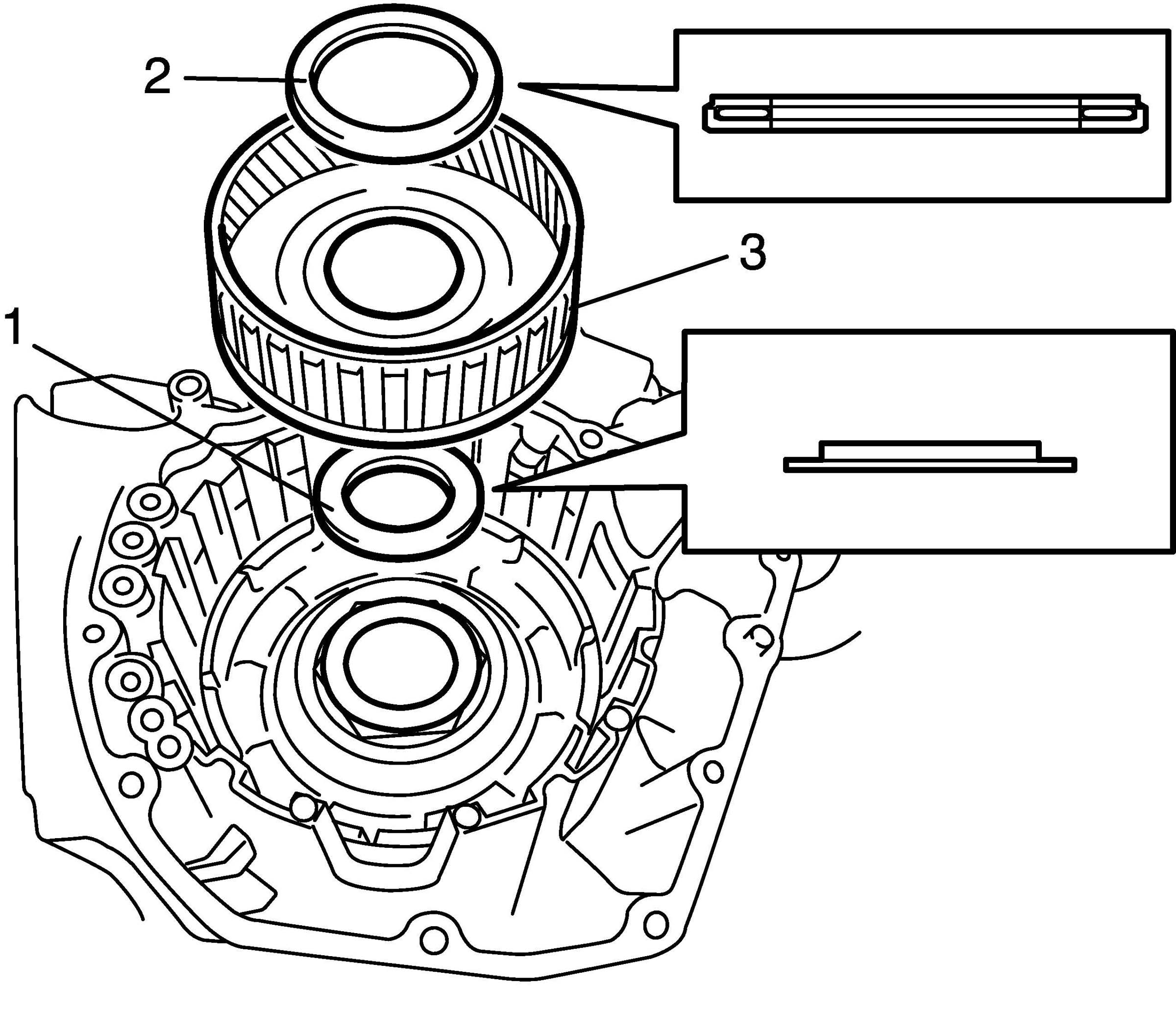 54. Place input shaft rear thrust bearing front race (2) and input shaft rear thrust bearing (3) to forward and direct clutch assembly (1).