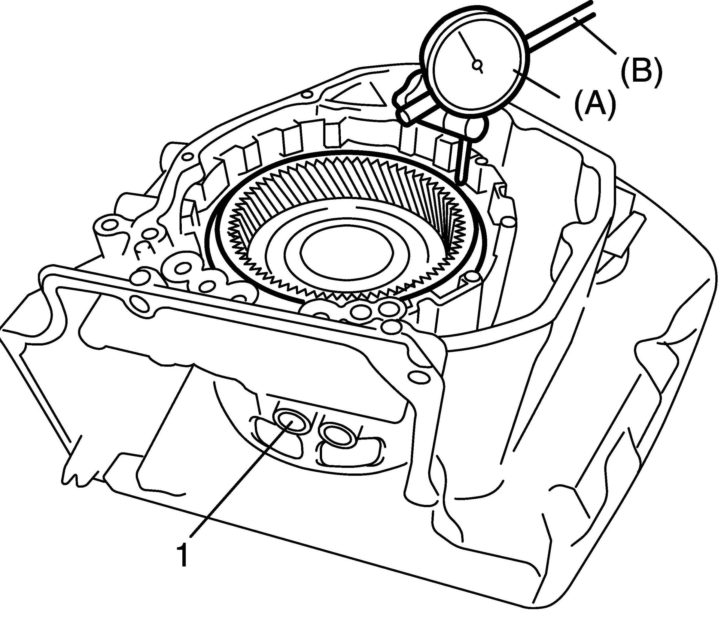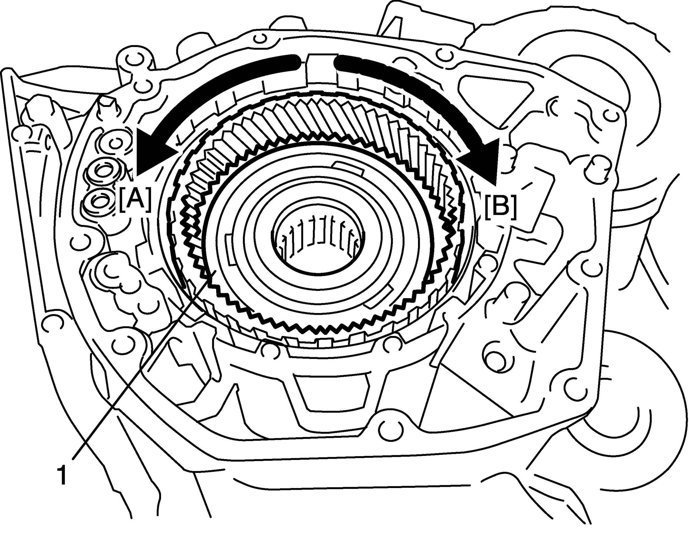 41. Make sure that front planetary ring gear (1) turns freely when turned counterclockwise [A] and locks when clockwise [B].
