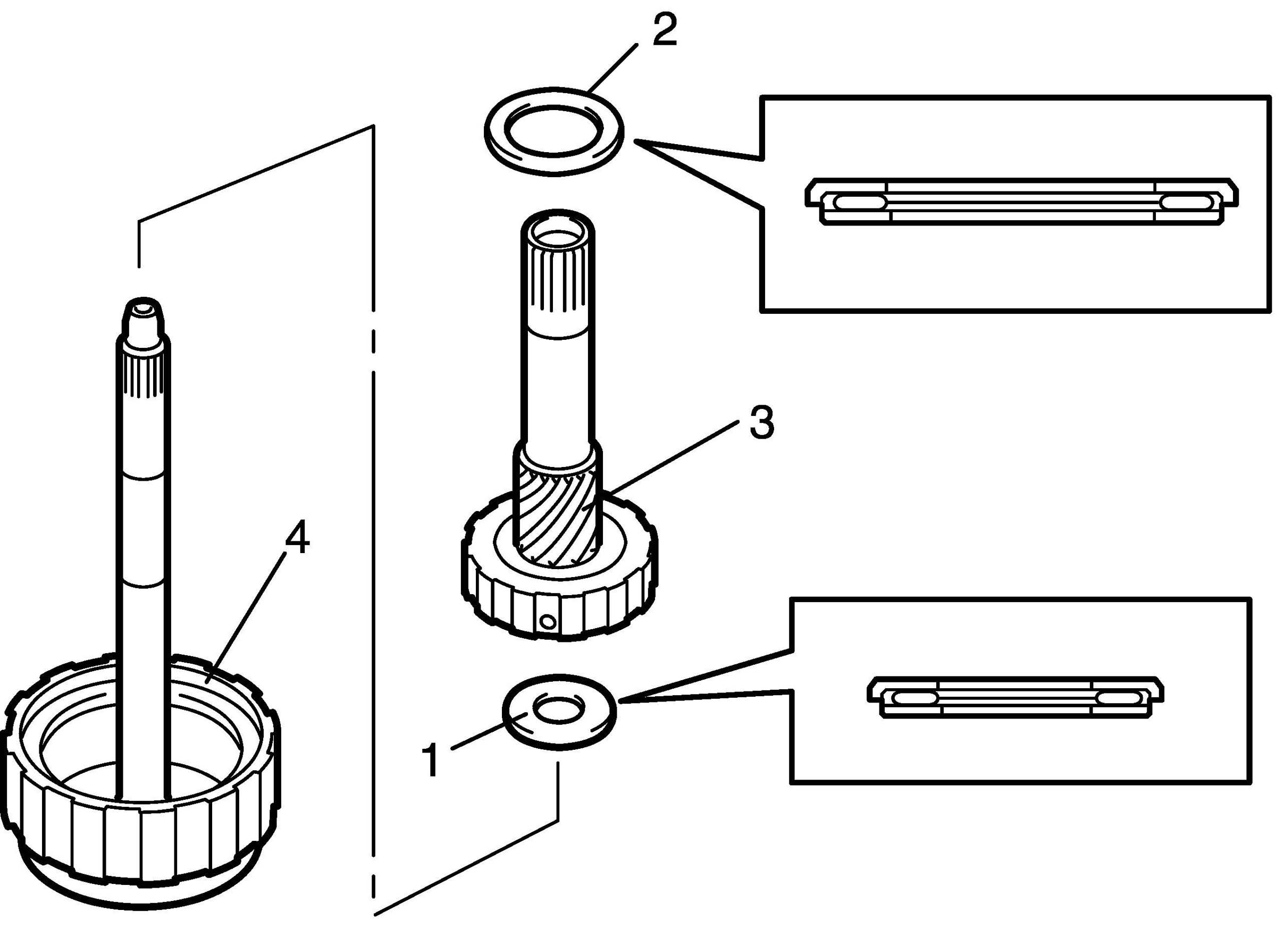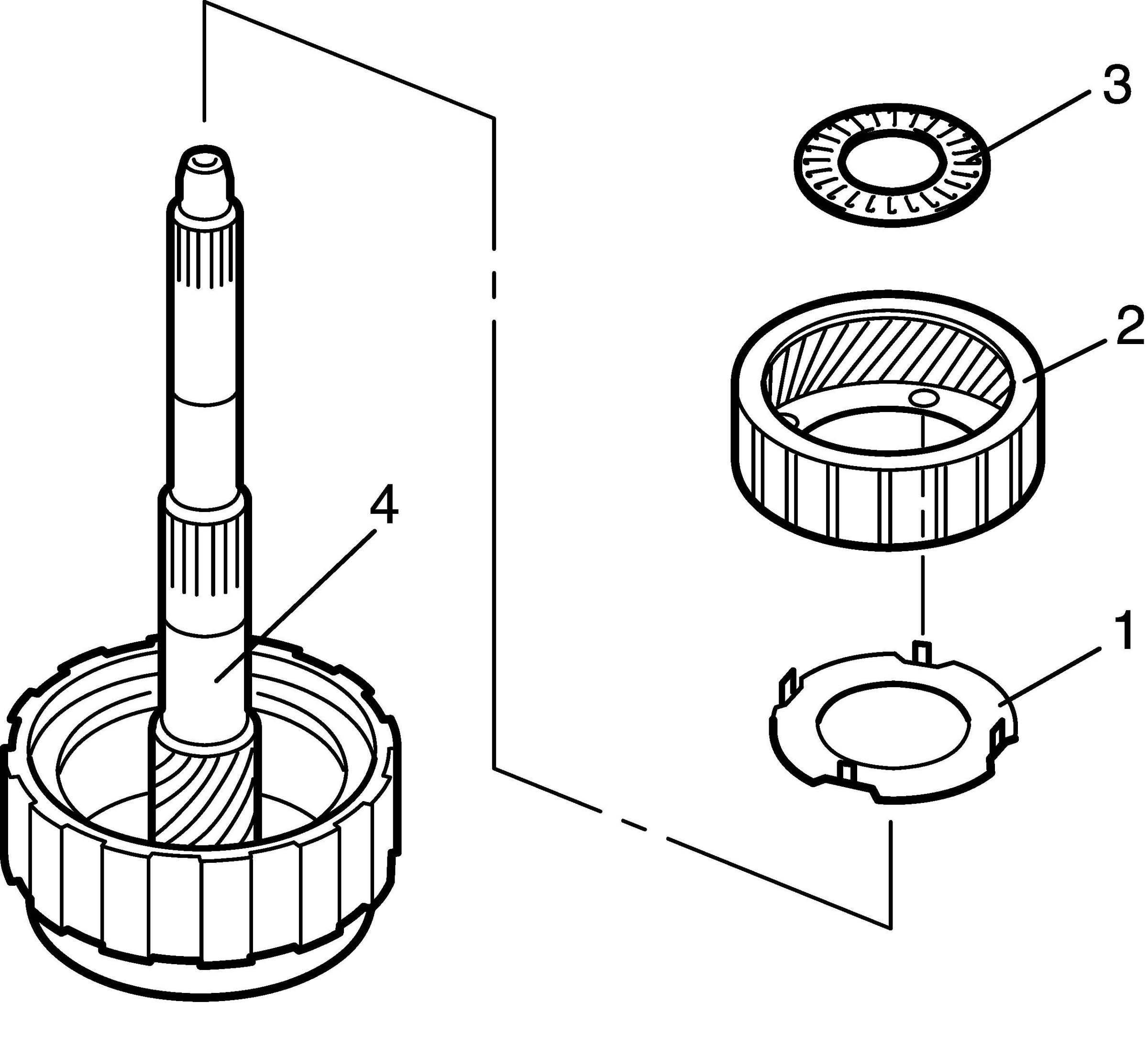 49. Install input shaft front thrust bearing (1), planetary sun gear (3), and rear planetary ring gear rear thrust bearing (2) to forward and direct clutch assembly (4).