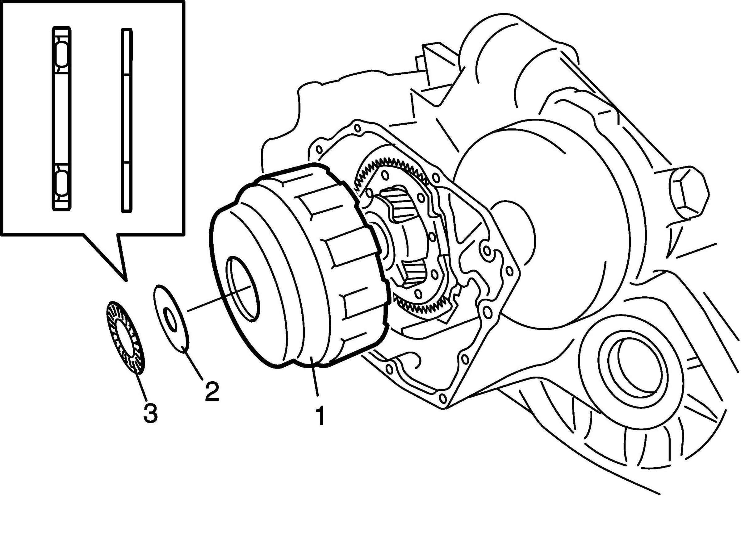 53. Apply petroleum jelly to input shaft thrust bearing front race (2) and input shaft rear thrust bearing (3).