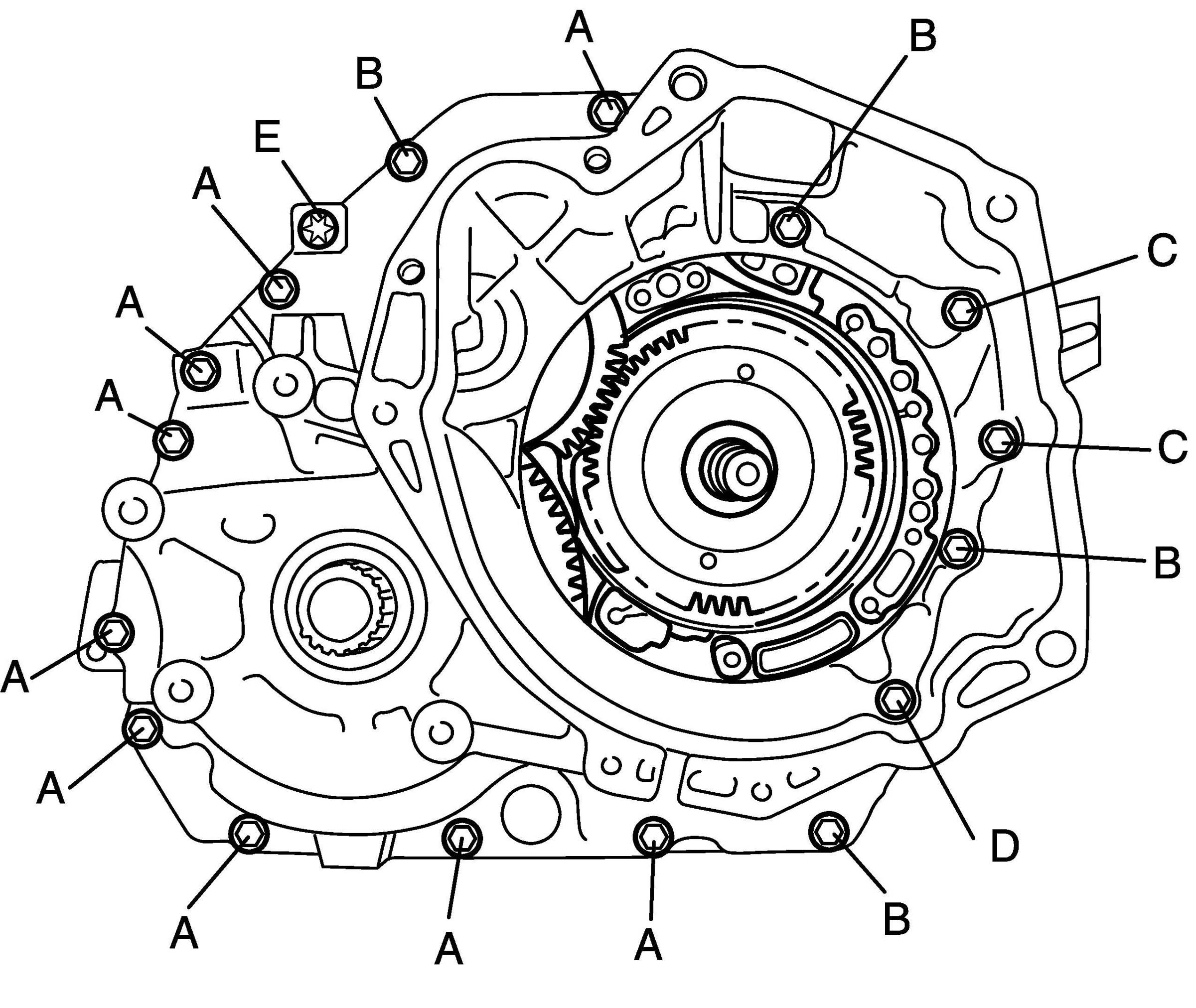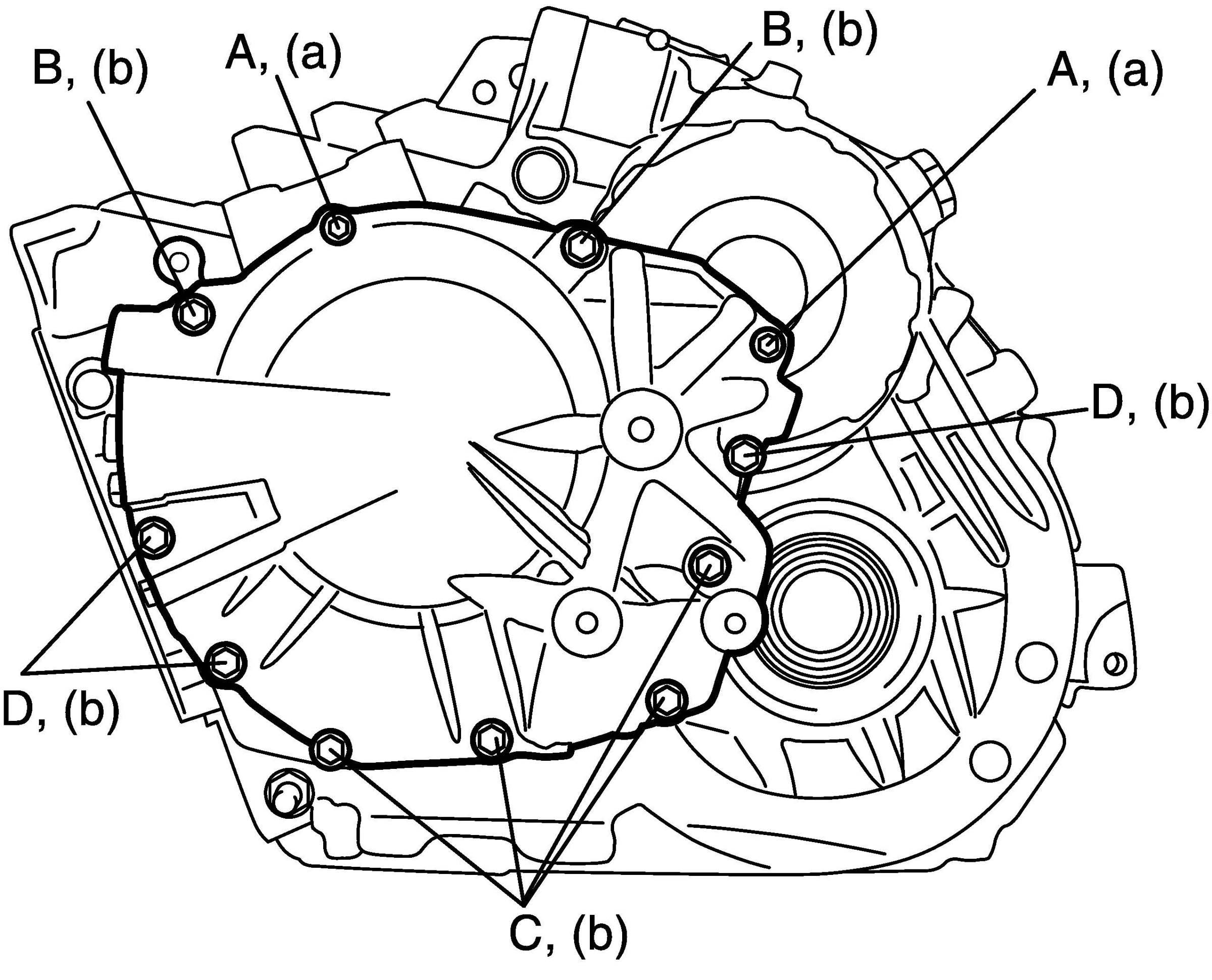 NOTE: Make sure to use new transaxle rear cover bolts A, B and D.