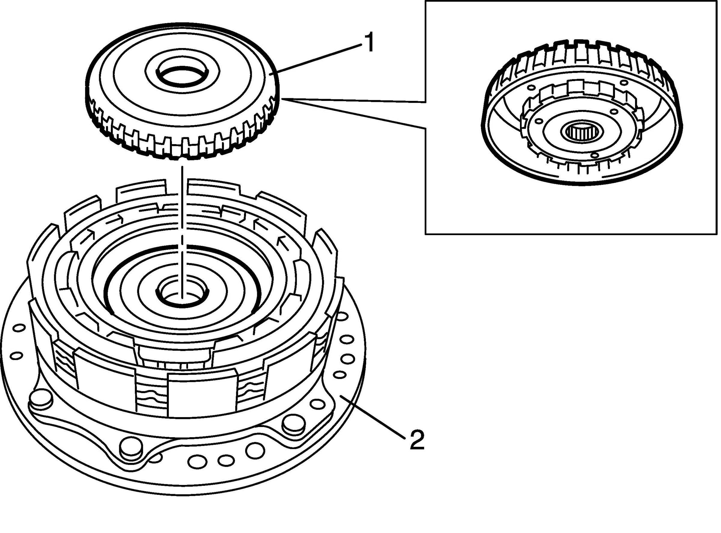 46. Place front planetary carrier rear thrust bearing race (1) onto planetary front gear (2).