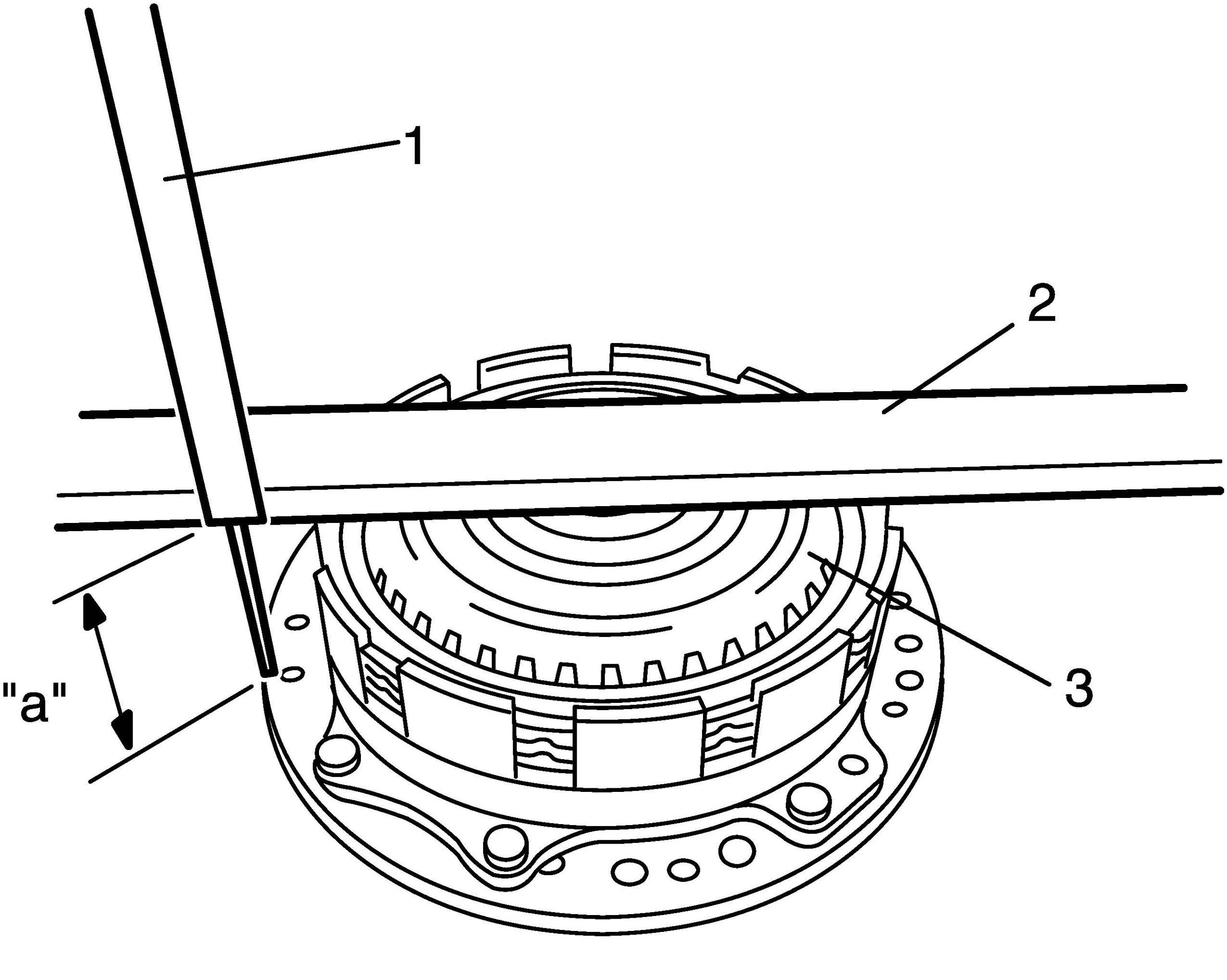 Measure the distance "a" by using vernier (1) and straight edge (2). If distance is out of specification, remove one-way No. 1 clutch assembly (3) and install them properly.