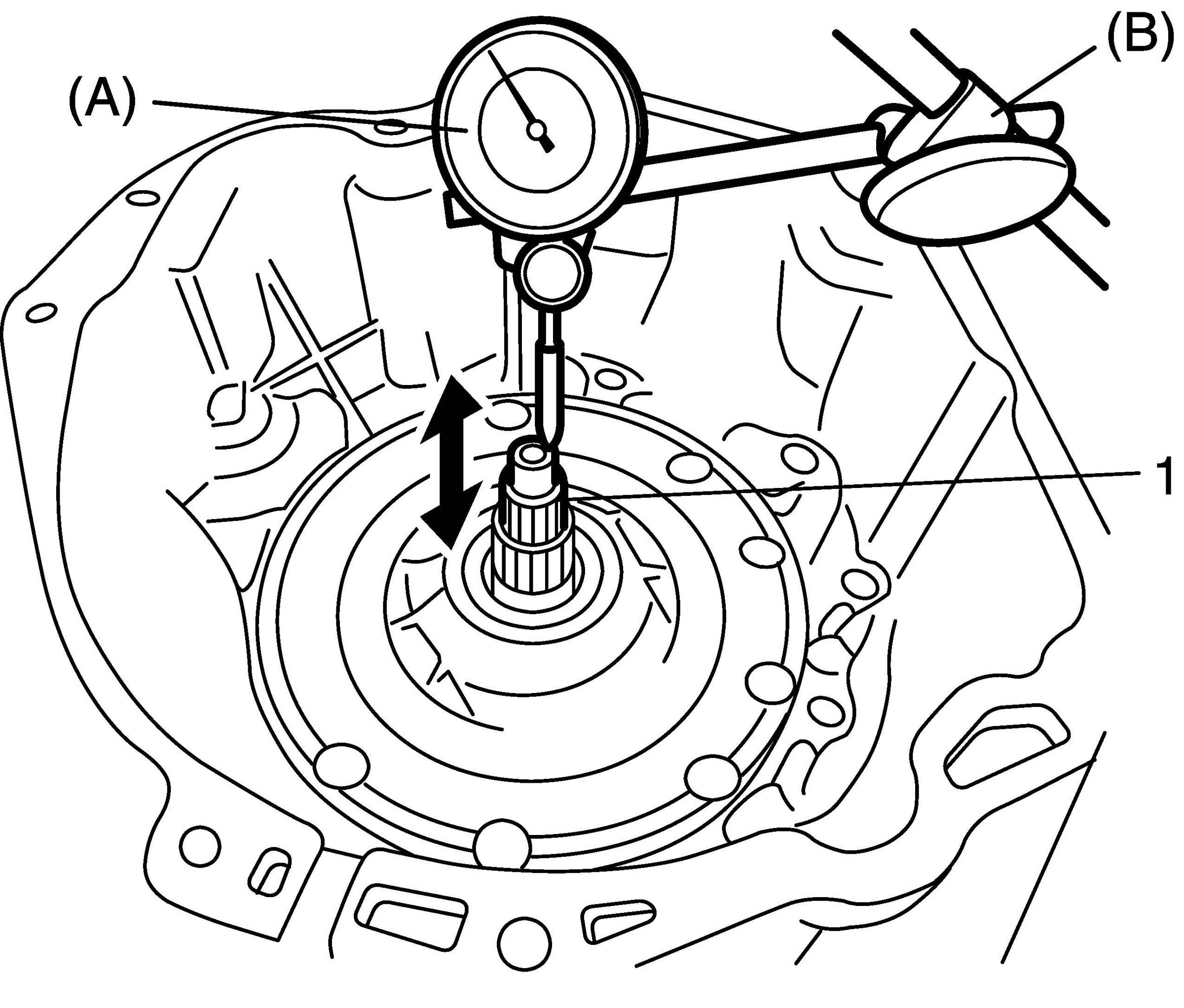 77. Measure end play of input shaft (1), using special tool. If end play is out of specification, replace input shaft rear thrust bearing front race in the following so as end play to be in standard value.