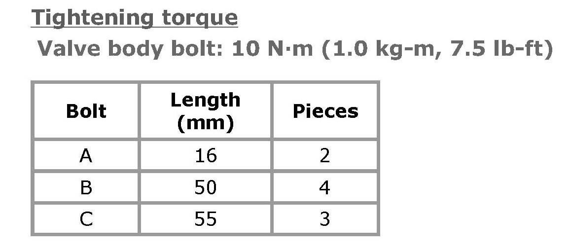 Valve body bolt: 10 Nm (1.0 kgf-m, 7.5 ft. lbs.)