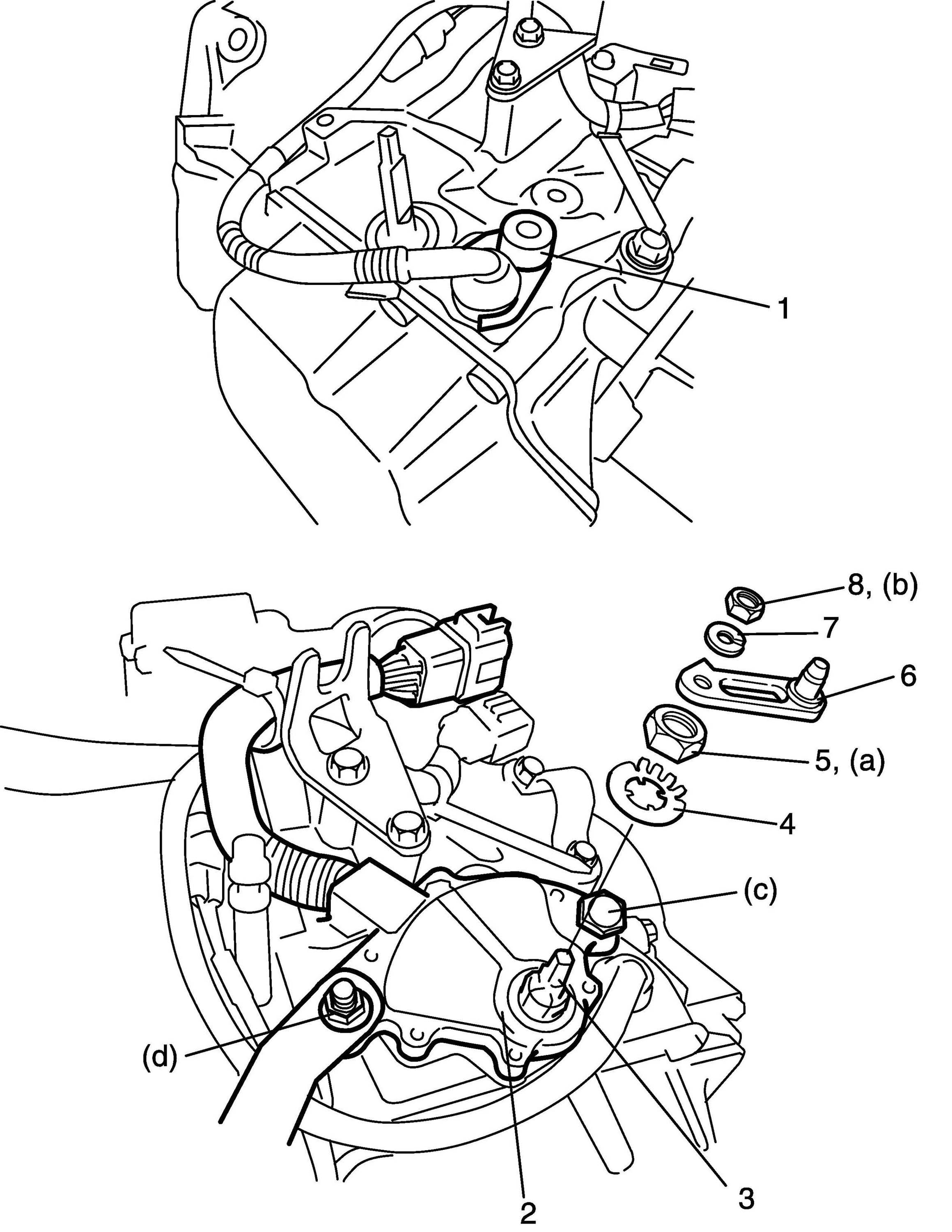 f) Install manual shift lever (6), washer (7) and tighten nut (8) to specified torque.