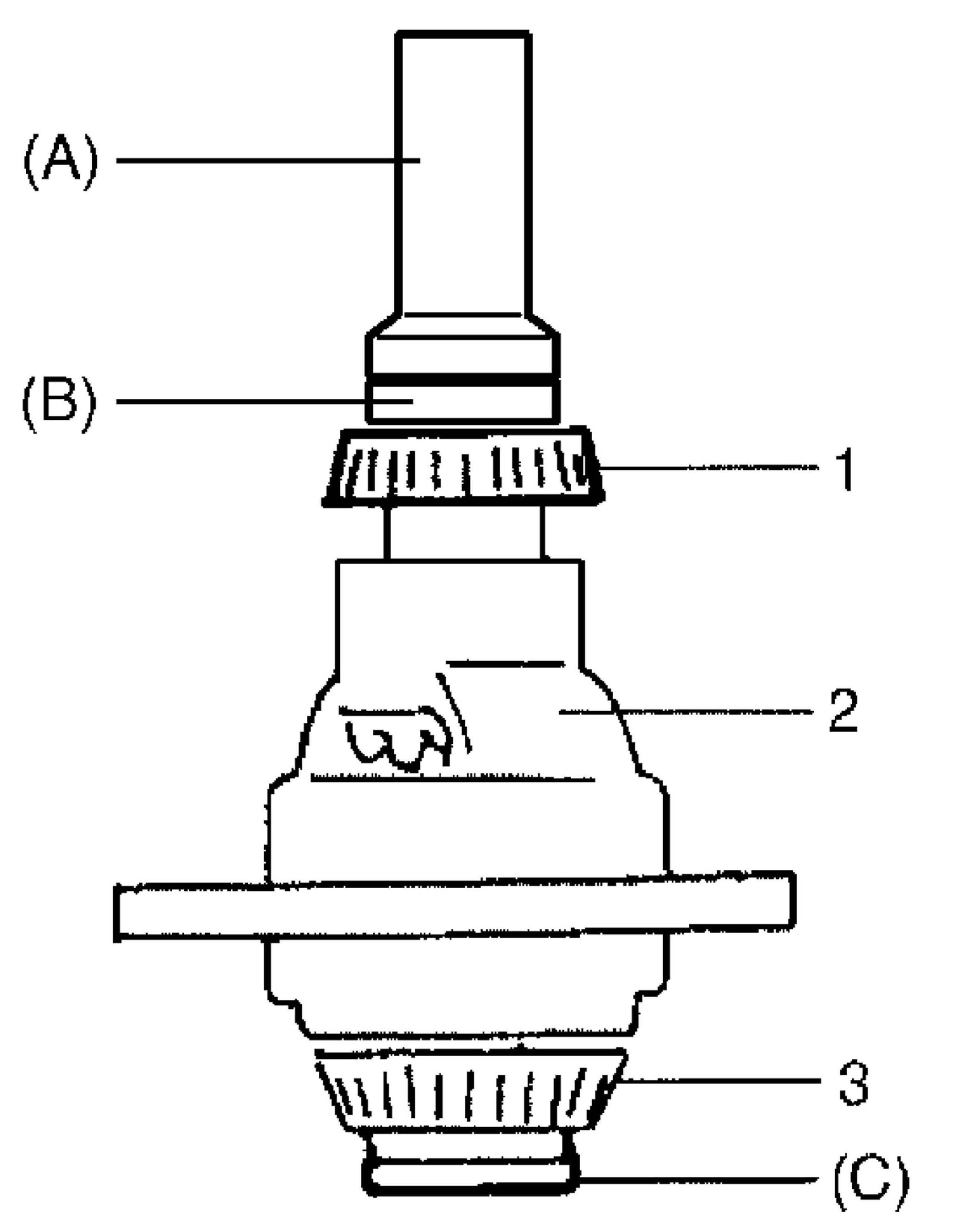 4. Drive out differential pinion shaft (3) pin by using special tool and hammer and then disassemble components parts.