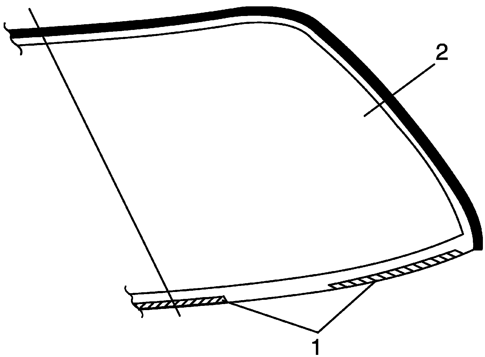 ^ Press glass (2) against fittings surface of body panel quickly after adhesive (1) is applied.