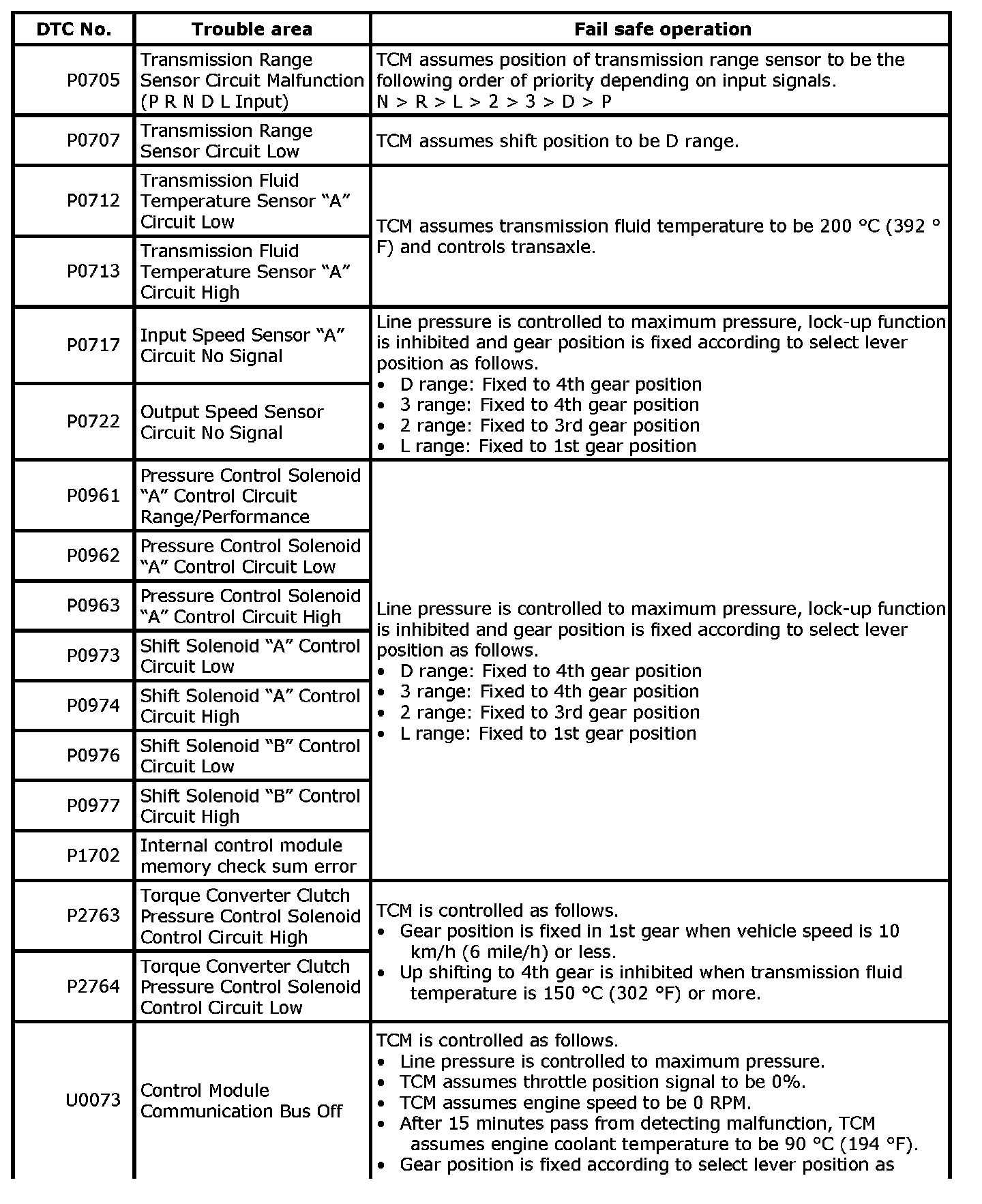 Fail Safe TableThis function is provided by the safe mechanism that assures safe driveability even when the solenoid valve, sensor or its circuit fails. The following table shows the fail safe function for each fail condition of sensor, solenoid, TCM or its circuit.