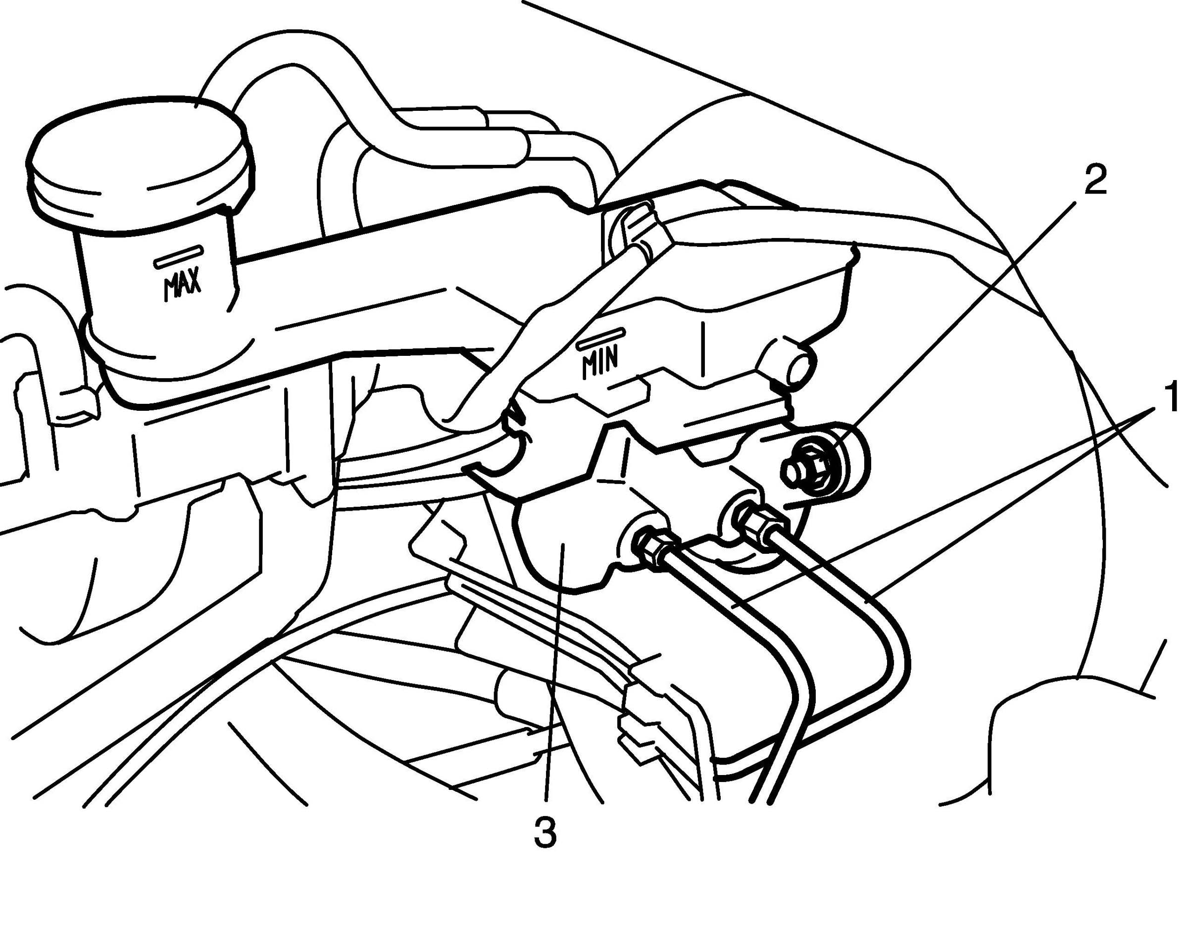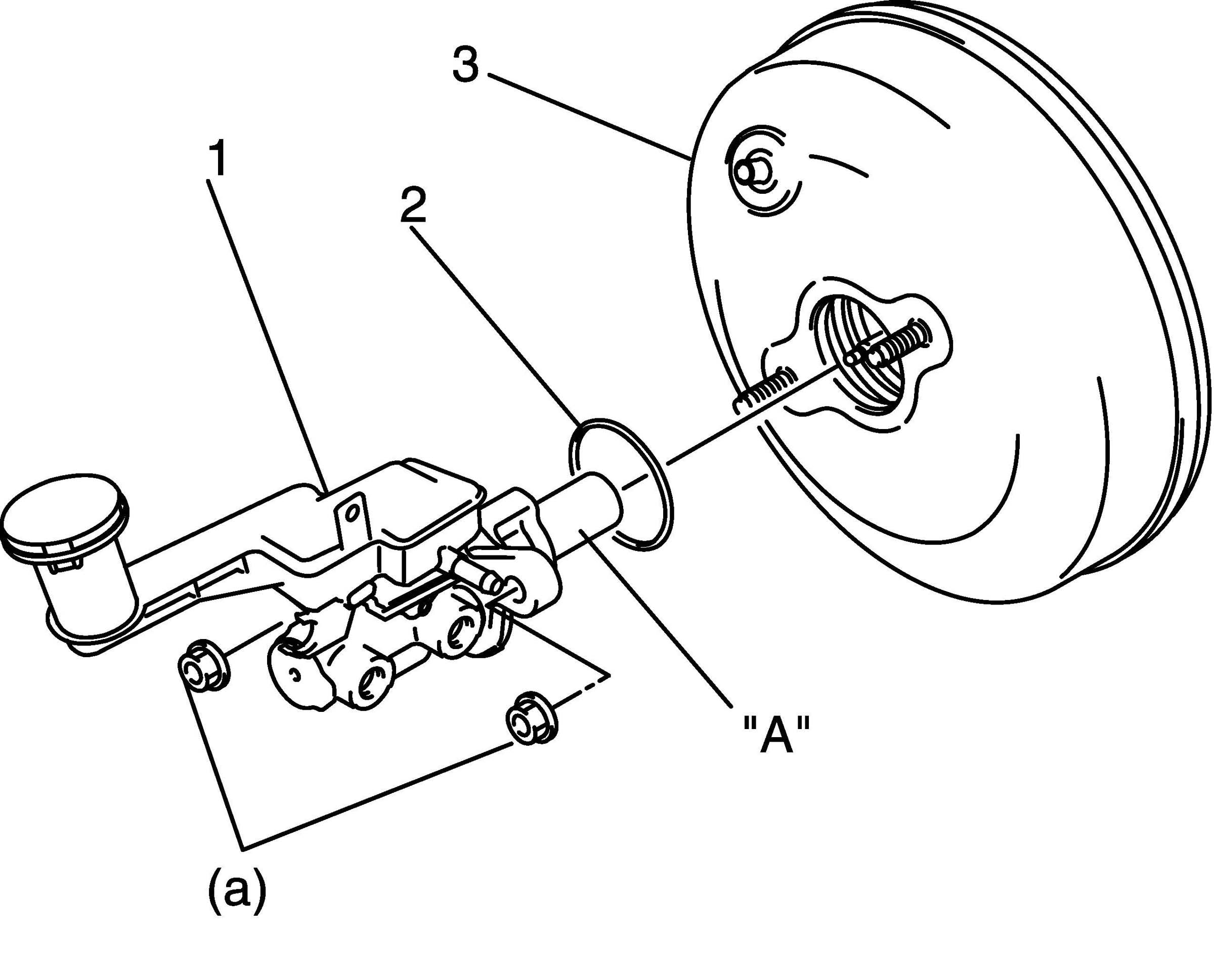 3. Install master cylinder assembly (1) to brake booster (3) and tighten master cylinder fixing nuts to specified torque.